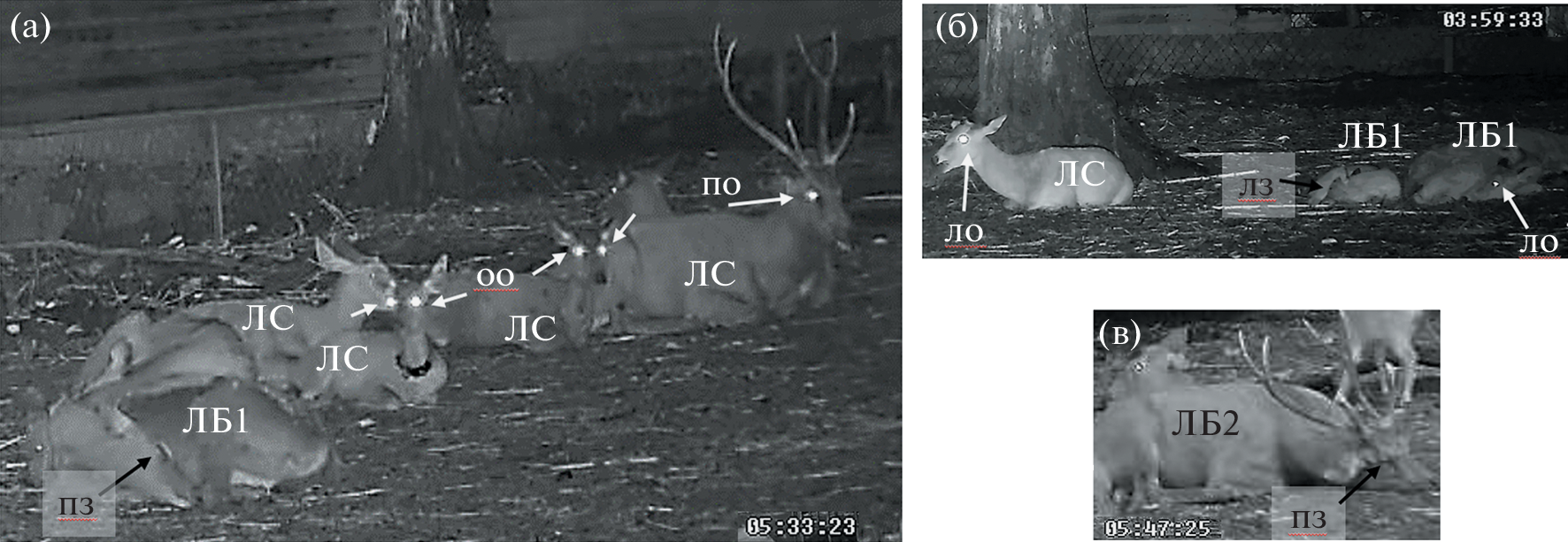 Методом видеорегистрации было установлено соотношение между позами, стадиями сна и состоянием глаз у двух видов оленей – индийского замбара (Rusa unicolor) и пятнистого оленя (Cervus nippon). Животные обоих видов отдыхали в положении лежа – в стернальном, держа голову над землей, и в латеральном, положив голову на круп или на землю. На покой приходилось не менее 80% времени в этих позах. По поведенческим критериям большая часть покоя была медленноволновым сном. Эпизоды вздрагиваний глаз (РЕМ сон) регистрировались только в латеральной позе, длительность эпизода не превышала 2 мин. В покое в стернальной позе глаза у оленей большую часть времени были открыты: в среднем 96% у замбаров и 82% у пятнистых оленей. Длительность эпизода открытого глаза достигала у замбаров 8.4 мин и у пятнистых оленей до 3.3 мин. В латеральном положении такие эпизоды были в 4 и в 1.5 раза короче. Сон с открытыми глазами с приподнятой над землей головой может быть важным механизмом поддержания бдительности у копытных.