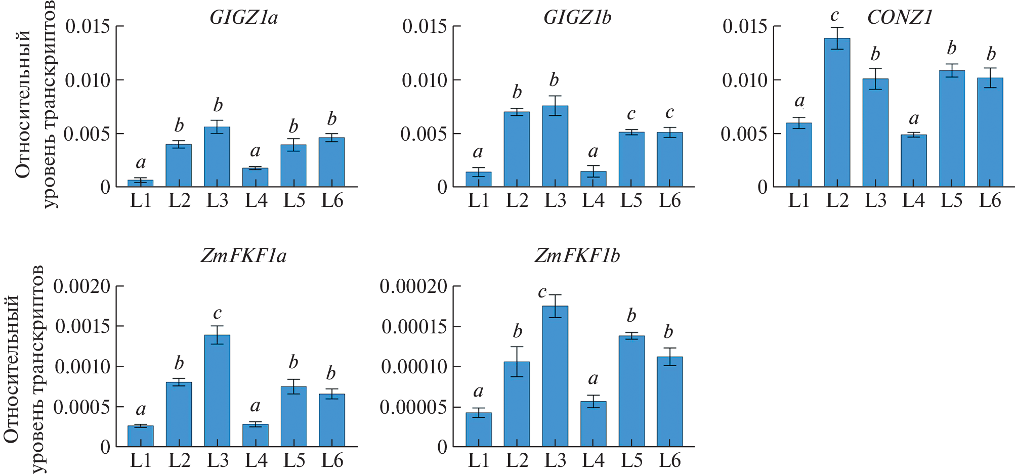 Twenty inbred lines of maize Zea mays L. were characterized by the duration of phenophases, including the timing of flowering and ripeness. The expression of key genes for initiation of flowering, CONZ1, GIGZ1a, GIGZ1b, ZmFKF1a, and ZmFKF1b, was studied in seedlings of six maize lines with different ripeness periods under long photoperiod conditions. A significantly lower level of transcripts of all five genes was found in early ripening lines in comparison with late ripening accessions. A similar expression of the paralogous GIGZ1a and GIGZ1b genes was shown, as well as a significant predominance of ZmFKF1a expression in comparison with its paralogous gene ZmFKF1b.