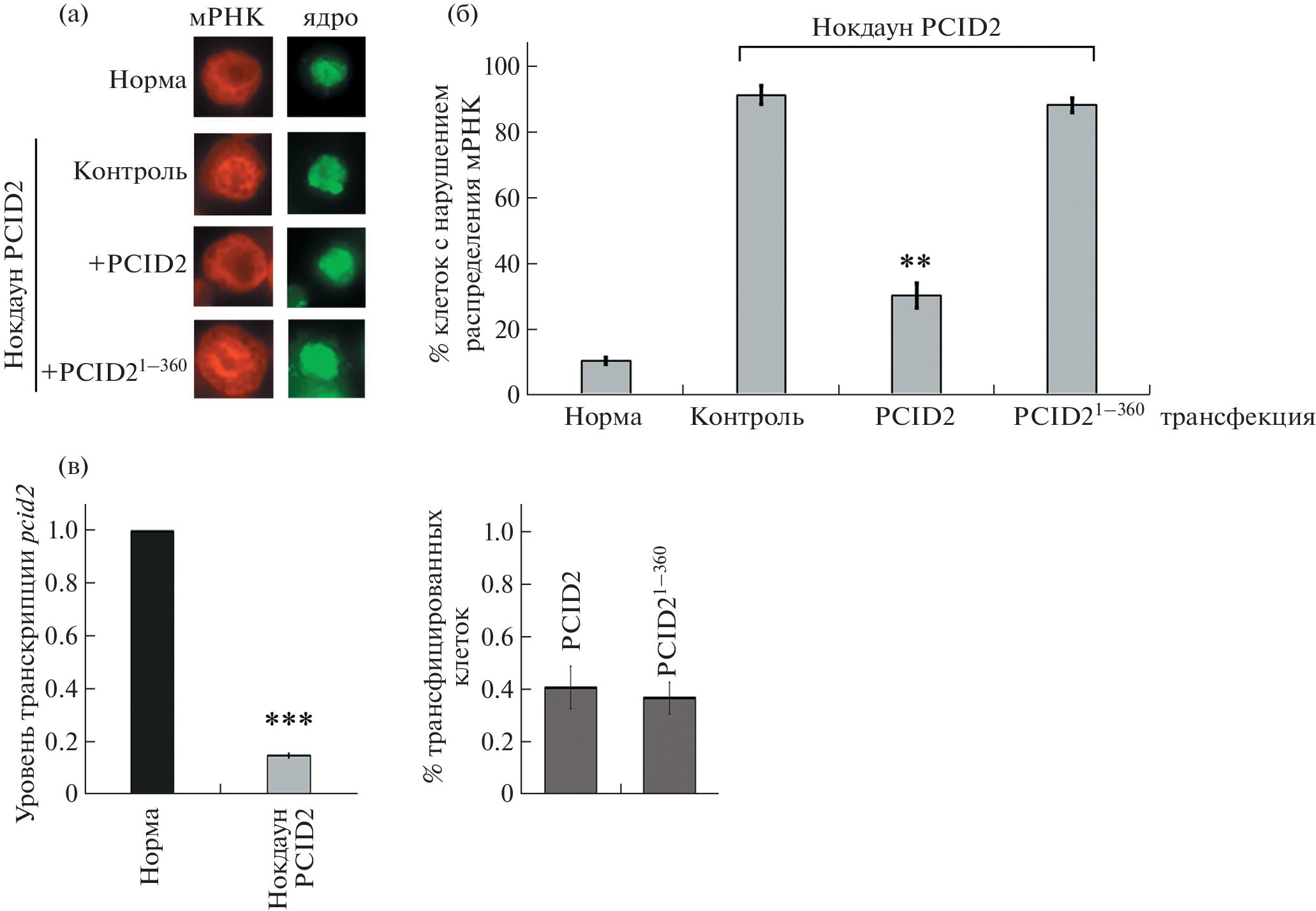 Following the transcription step, the newly synthesized mRNA is exported from the nucleus to the cytoplasm and further to the translation site. The TREX-2 complex is involved in the step of mRNA export from the nucleus to the cytoplasm. This complex in Drosophila melanogaster consists of four proteins: Xmas-2, PCID2, ENY2, Sem1p. In our work, we have shown that deletion of the C-terminal sequence of PCID2 leads to a decrease in the interaction of the protein with RNA and to impaired mRNA export from the nucleus to the cytoplasm in D. melanogaster.