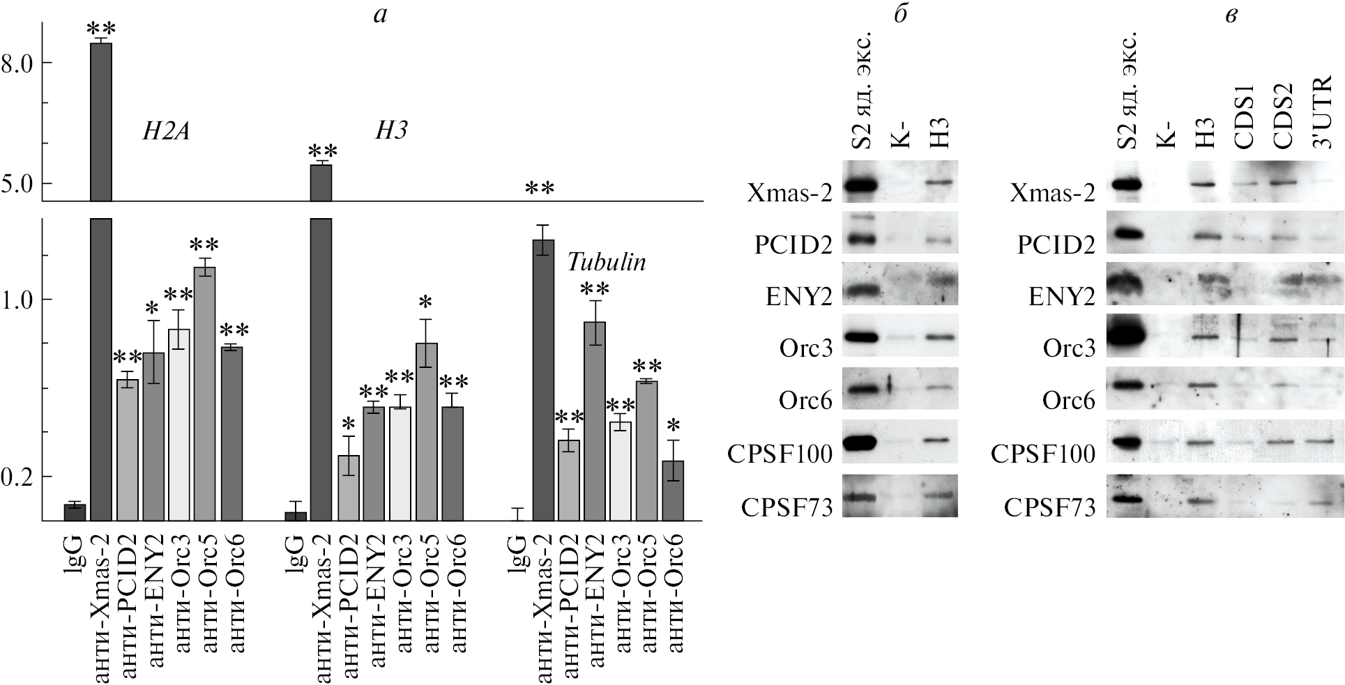 Была поставлена задача исследовать взаимодействие комплекса TREX-2-ORC c мРНП частицами гистонов. Ранее в очищенном общем TREX-2-ORC комплексе были найдены ORC субъединицы Orc1, Orc3, Orc4, Orc5, Orc6 [9]. Взаимодействие комплекса с мРНП гистонов было протестировано для TREX-2 субъединиц Xmas-2, PCID2, ENY2 и для ORC белков Orc3, Orc5, Orc6. Для этого был применен метод соосаждения РНП частиц антителами (RIP) из ядерного экстракта S2 клеток. Антитела к белкам – компонентам TREX-2 и ORC эффективно осаждали мРНК генов гистонов Н2А и Н3 (рис. 1, а), что указывает на взаимодействие комплекса ТREX-2-ORC с мРНП частицами данных гистонов. Аналогичные данные были получены для мРНК Н4 и Н2В. В качестве положительного контроля показано взаимодействие ТREX-2-ORC с поли(A)-содержащей мРНК β-тубулина, которое было продемонстрировано ранее [9].