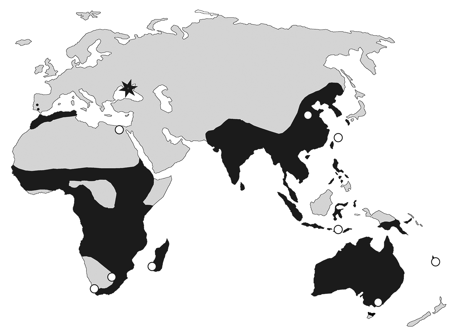Рис. 1. География современного распространения и ископаемых плиоцен-четвертичных находок трехперсток (Turnicidae): сплошная заливка – современный ареал семейства Turnicidae; белые круги – ранее известные плиоцен-четвертичные находки (см. текст); звезда – новая раннеплейстоценовая находка Turnix sp. в пещере Таврида, Центральный Крым.