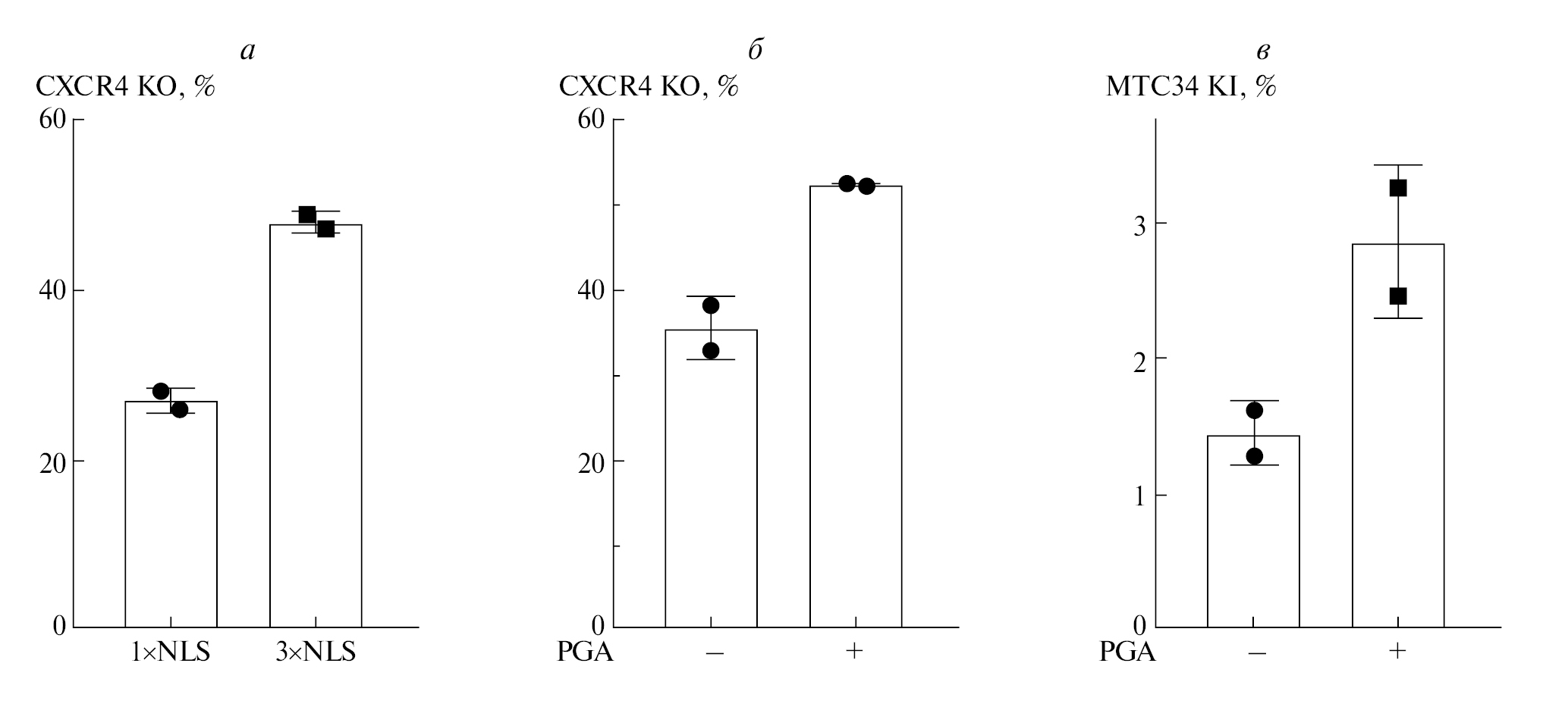 В отсутствие gRNA белок Cas9 нестабилен и даже в комплексе с gRNA в составе RNP может формировать нефункциональные агрегаты [11]. Согласно работе Nguyen et al., предотвратить агрегацию и повысить стабильность RNP можно с помощью анионного полимера PGA [11]. Поэтому была оценена эффективность нокаута CXCR4 с помощью Cas9-3xNLS в присутствии PGA. Для этого использовали PGA с молекулярной массой 15–50 кДа, разведенную до концентрации 100 мг/мл в деионизованной воде. Для формирования RNP комплексов PGA использовали как описано в статье Nguyen et al [11]: на один образец смешивали 4 мкл PGA (100 мг/мл в воде) и 200 пмоль gRNA, затем данную смесь добавляли к 200 пмоль Cas9 в буфере R. Было обнаружено, что добавление PGA к RNP комплексам увеличивало уровень нокаута CXCR4 в 1.4 раза (рис. 2, б).