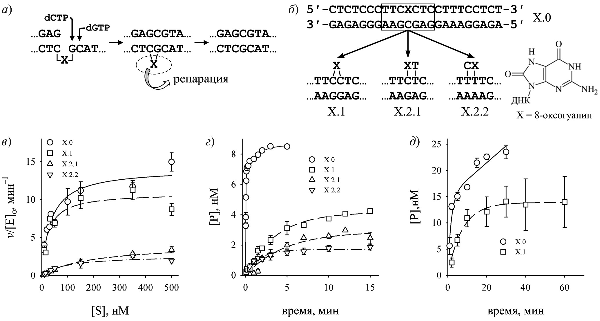 Рис. 1. Схема образования микроделеций при проскальзывании ДНК-полимеразы (а); схема строения использованных в работе ДНК-субстратов (б); графики зависимости начальной скорости реакции от исходной концентрации субстрата [S] для фермента Fpg (4.2 нМ) (условия реакции: 25 мМ Трис–HCl pH 7.5, 50 мМ NaCl, 1 мМ ЭДТА, 1 мМ ДТТ, 37 °C) (в); кинетические кривые расщепления субстратов ферментом OGG1 в том же буфере при [E]0 = 5 мкМ, [S]0 = 20 нМ (г) и [E]0 = 10 нМ, [S]0 = 100 нМ (д). Для субстратов X.2.1 и X.2.2 расщепления в (д) не наблюдалось. После реакции с OGG1 смеси прогревали со 100 мМ NaOH (5 мин, 95°C). Во всех случаях продукты реакции разделяли электрофорезом в 20%-ном полиакриламидном геле в присутствии 7 М мочевины и анализировали с помощью установки радиолюминесцентного сканирования Typhoon 9500 (GE Healthcare). На графиках приведены средние значения и стандартные отклонения по трем независимым экспериментам.