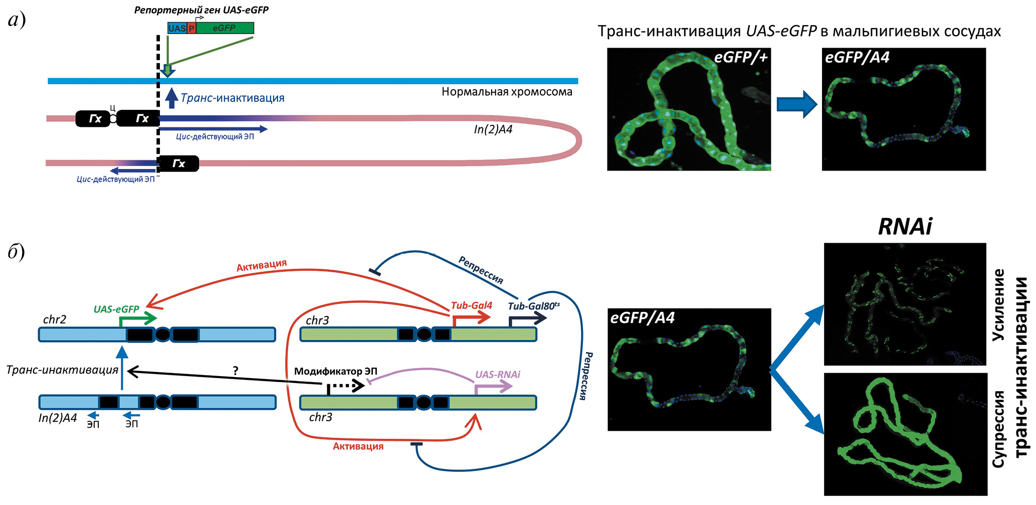 Гетерохроматиновый эффект положения (ЭП) приводит к изменениям структуры хроматина (гетерохроматинизации) и нарушениям экспрессии эухроматиновых генов при переносе к гетерохроматину. Хромосомная инверсия In(2)A4 (далее – A4) вызывает ЭП генов, расположенных рядом с новыми эу-гетерохроматиновыми границам (цис-инактивация), а также репортерных трансгенов, расположенных на гомологичной неперестроенной хромосоме (транс-инактивация) [1].