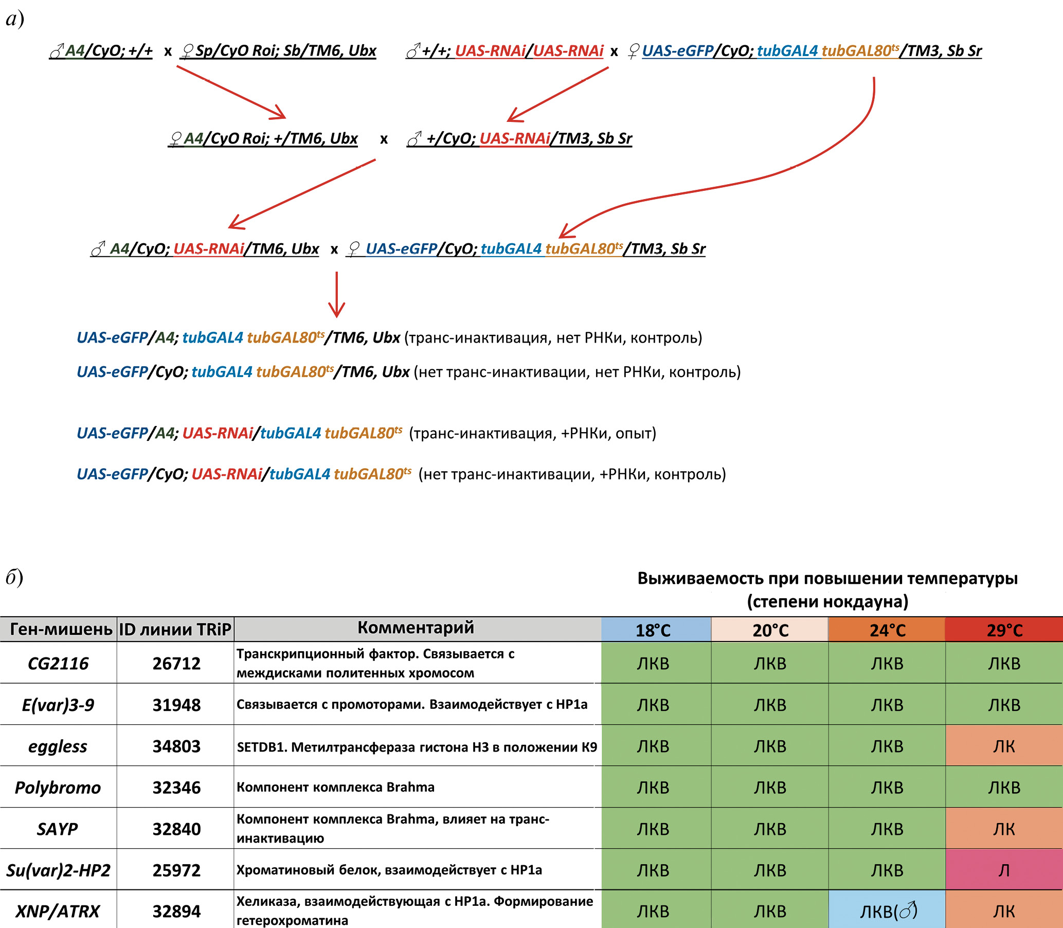 Рис. 2. Схема скрещиваний для получения генотипов, использованных для исследования эффектов нокдаунов компонентов хроматина на транс-инактивацию, таблица исследуемых генов и влияние нокдауна разной степени на жизнеспособность мух: ход скрещиваний и использованные в работе генотипы. Получены четыре генотипа, представляющие все возможные комбинации “наличие – отсутствие транс-инактивации” и “наличие – отсутствие нокдауна”. Во всех генотипах присутствуют гены GAL4 и GAL80ts. Отношение флуоресценции репортера в eGFP/A4 к eGFP/+ без UAS-RNAi (UAS-eGFP/A4; tubGAL4 tubGAL80ts/TM6 к UAS-eGFP/CyO; tubGAL4 tubGAL80ts/TM6) показывает уровень транс-инактивации без нокдауна гена-модификатора. Отношение флуоресценции репортера в eGFP/A4; UAS-RNAi к eGFP/+; UAS-RNAi (UAS-eGFP/A4; tubGAL4 tubGAL80ts/UAS-RNAi к UAS-eGFP/CyO; tubGAL4 tubGAL80ts/UAS-RNAi) показывает уровень транс-инактивации при нокдауне исследуемого гена. Отношение уровней транс-инактивации “нокдаун/без нокдауна” определяет степень влияния гена-модификатора на транс-инактивацию (а); влияние нокдауна исследуемых генов на жизнеспособность особей. Степень нокдауна увеличивается при повышении температуры, когда инактивация репрессора GAL80ts повышает концентрацию активного GAL4). Стадии развития обозначены как Л (личинка), К (куколка), В (взрослые). Соответственно, ЛКВ обозначает выживаемость на всех стадиях при данной температуре, ЛК – выживают личинки и куколки, Л – только личинки. В случае нокдауна XNP выживали самцы (б).