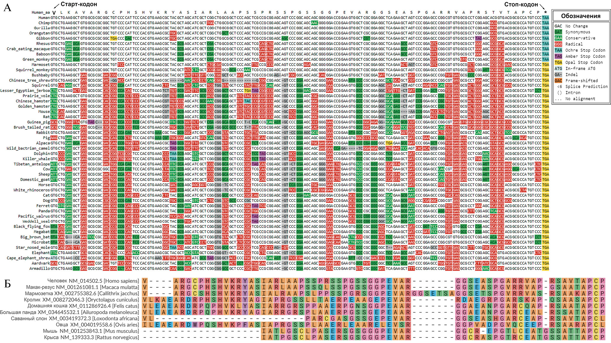 Рис. 4. Анализ консервативности вышележащей ОРС гена PRPF19 среди млекопитающих: выравнивание вышележащей ОРС гена PRPF19 в геномном браузере CodAlignView среди некоторых млекопитающих. Указаны положения первого старт-кодона вышележащей ОРС у человека по данным на рис. 2 и стоп-кодона (A); Выравнивание последовательностей белков, кодируемых вышележащей ОРС в мРНК гена PRPF19, среди указанных видов в MSA4U [17]often encoding so-called leader peptides. Начало белка выбрано по первому возможному старт-кодону в соответствующей рамке считывания (Б).
