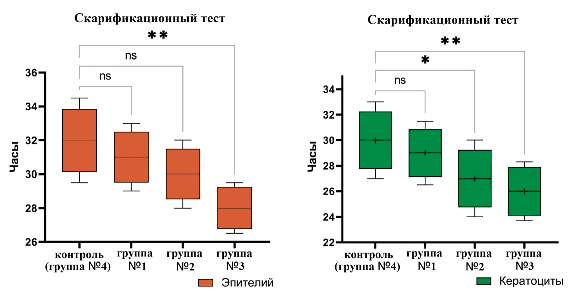Рис. 1. Результаты скарификационного теста эпителиальных клеток и кератоцитов (*;**– статистически значимые отличия по сравнению с контролем – группой 4, p < 0,05; ns – отличия между опытными группами и контролем статистически не значимы, p > 0,05).