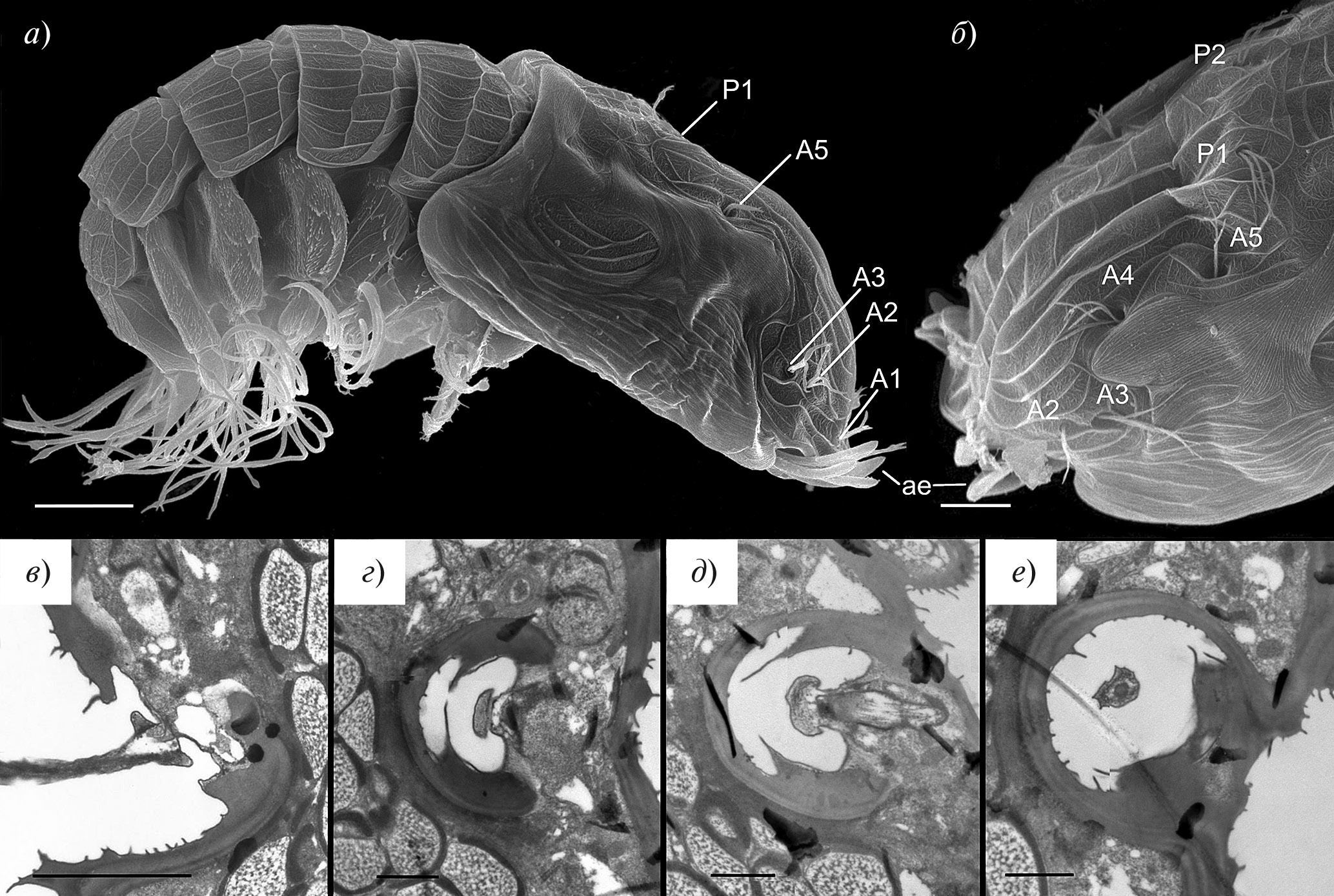 Рис. 1. Сенсорные структуры карапакса самцов A. pertzovi: а – габитус самца, вид сбоку (сканирующая электронная микроскопия, СЭМ); б – передняя часть карапакса (СЭМ); в – продольный срез через щетинку поры А4 (трансмиссионная электронная микроскопия, ТЭМ); г – е – последовательные поперечные срезы карапакса через пору А5 (ТЭМ). Обозначения: A1–A5, P1–P2 поры с щетинками переднего и заднего кластеров, ae – эстетаски. Масштабные линейки: а – 20 мкм; б – 10 мкм; в – 2 мкм; г–е – 1 мкм.