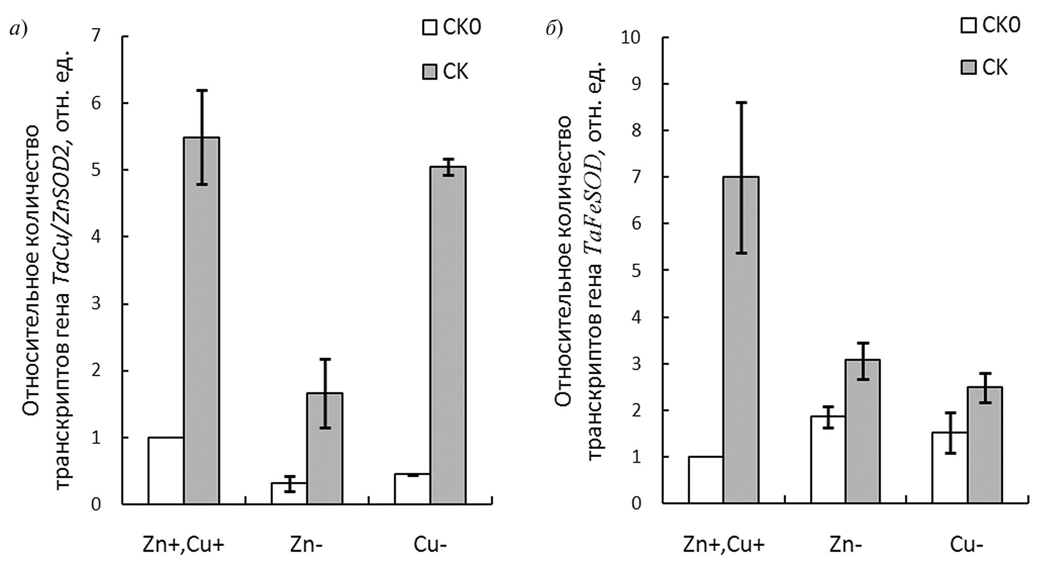 В ходе исследований установлено, что у растений пшеницы, чьи семена не были обработаны СК (вариант СК0), недостаток цинка (Zn–) и меди (Cu–) в корнеобитаемой среде вызывал заметное снижение количества транскриптов гена ТаCu/ZnSOD2 в 4 и 2 разa, соответственно, по сравнению с их оптимальным содержанием (рис. 1а), при этом уровень мРНК гена TaFeSOD, наоборот, возрастал почти в 2 раза (рис. 1б).