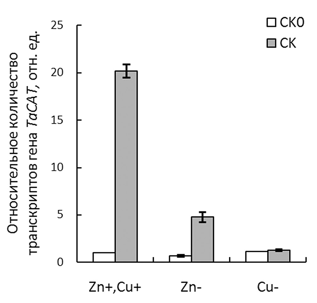 Наряду с СОД важную роль в поддержании окислительно-восстановительного баланса клетки играет каталаза – один из наиболее эффективных антиоксидантных ферментов, нейтрализующих пероксид водорода. В отношении ее участия в антиоксидантном ответе клетки на низкий уровень микроэлементов сведений крайне мало. Хотя показано, что при низком содержании цинка в листьях ячменя [19] уровень экспрессии гена Cat был более высоким, чем при его оптимальном содержании. Нами же было обнаружено, что у пшеницы в варианте без обработки СК количество транскриптов гена TaCAT в листьях было относительно невысоким и при дефиците цинка или меди практически не менялось (рис. 2). В отличие от этого после обработки семян СК уровень экспрессии этого гена резко возрастал как при оптимальном содержании цинка и меди (почти в 20 раз по сравнению с вариантом СК0), так и при недостатке цинка (в 5 раз) в корнеобитаемой среде. Но при недостатке меди подобный эффект отсутствовал.