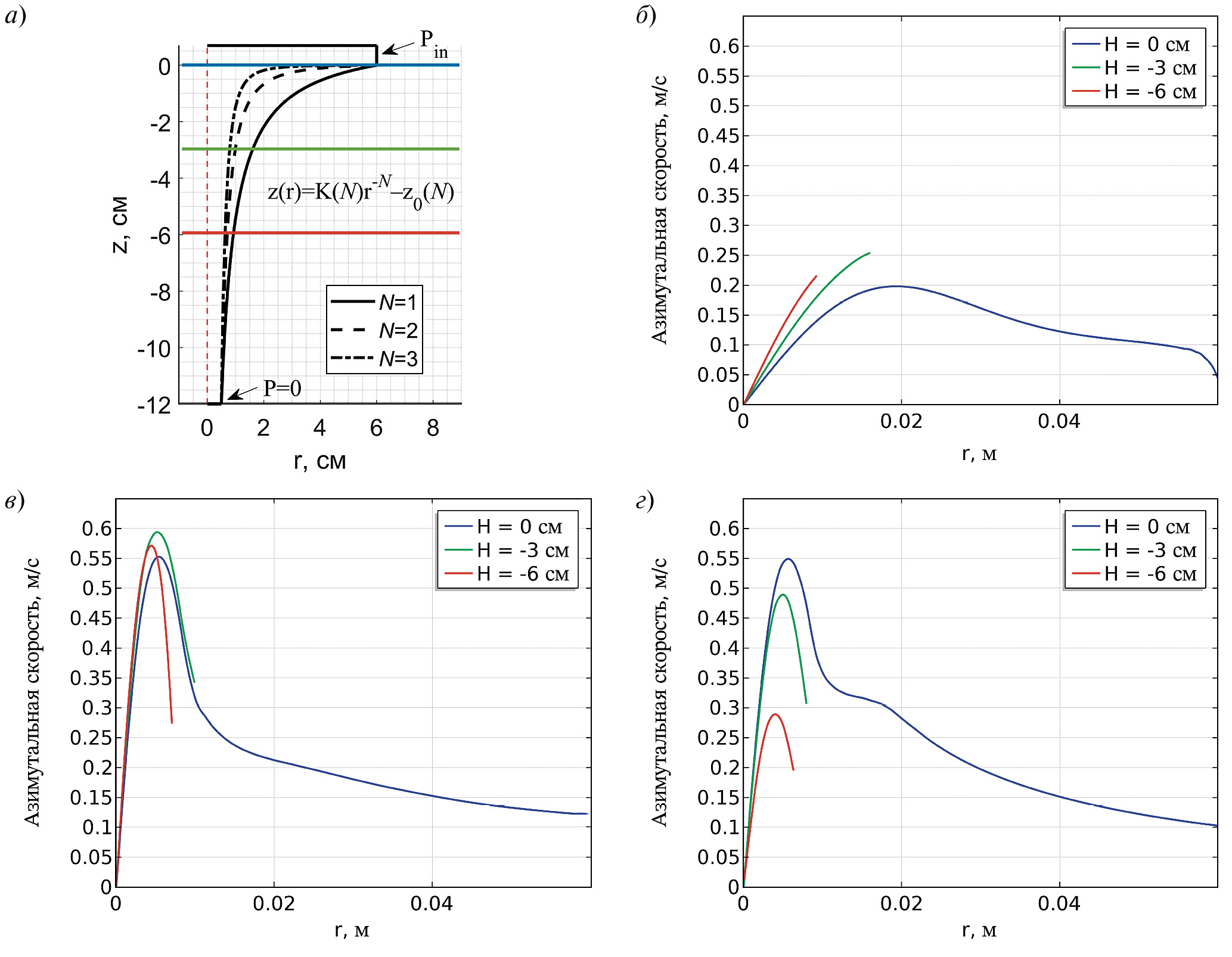 Численное определения структуры uφ(r) при N = 1 показало, что вихревая структура течения формируется только в начале струи, так как форма канала позволяет течению развиваться в аксиальном направлении. Это выражается в отсутствии локальных максимумов uφ(r) при высотах –3 и –6 см и в преобладании аксиальной составляющей скорости, что качественно уравнивает закрученное и незакрученное течения в этом канале