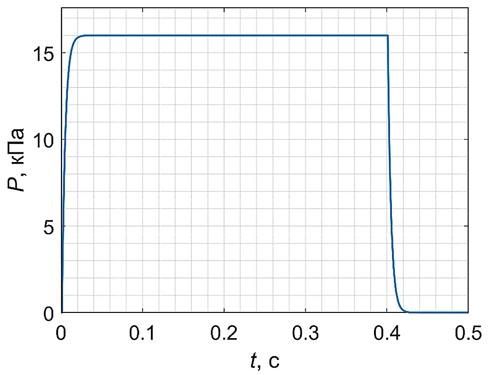 Рис. 14. Расчетная осциллограмма импульса статического давления на входе в канал при динамическом моделировании, имитирующая систолу сердечного цикла.