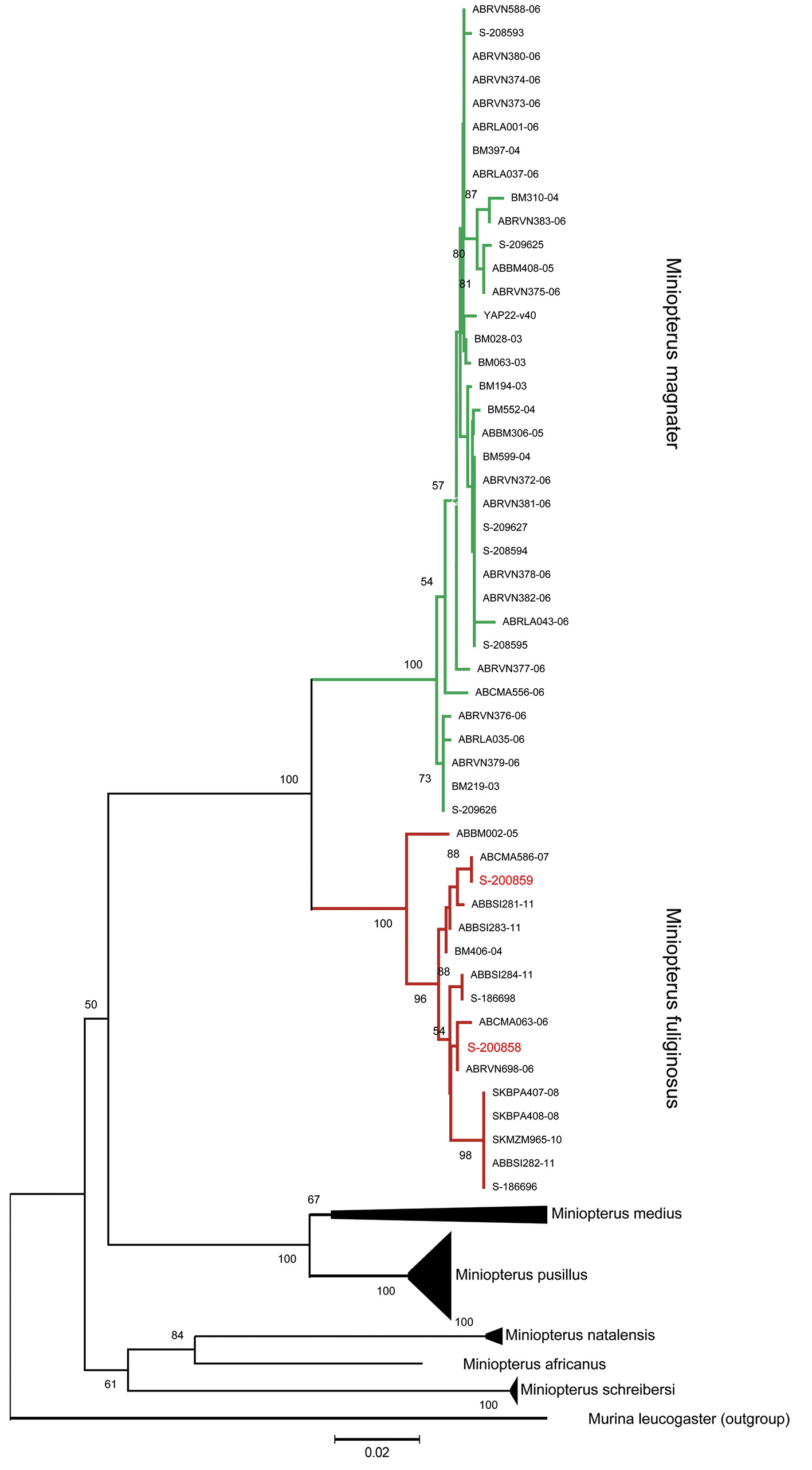 3. Fig. 2. Phylogenetic relationships of representatives of the genus Miniopterus according to the concatenate of two mitochondrial genes (COI and cytb). Only original sequences were included in the analysis, with the exception of M. schreibersii from Italy, taken as an outgroup. Specimens from Cao Bang Province are marked in red.