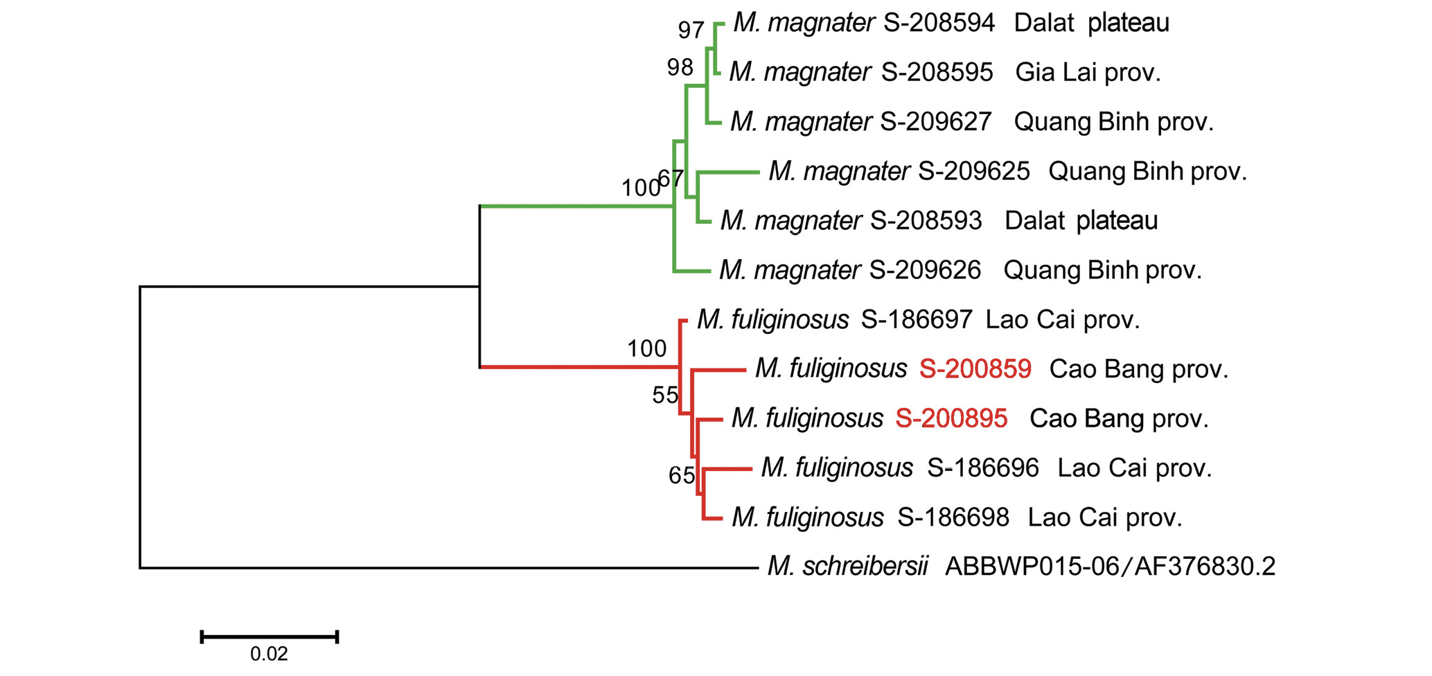 Как и в ранее опубликованных работах [8], митохондриальные гены хорошо разделяют M. fuliginosus и M. magnater (рис. 1, 2): средние дистанции между кладами составили 6.0% для cytb, 6.85% для COI и 6.44% для конкатената обоих генов. При этом экземпляры из провинции Каобанг однозначно определяются как M. fuliginosus.