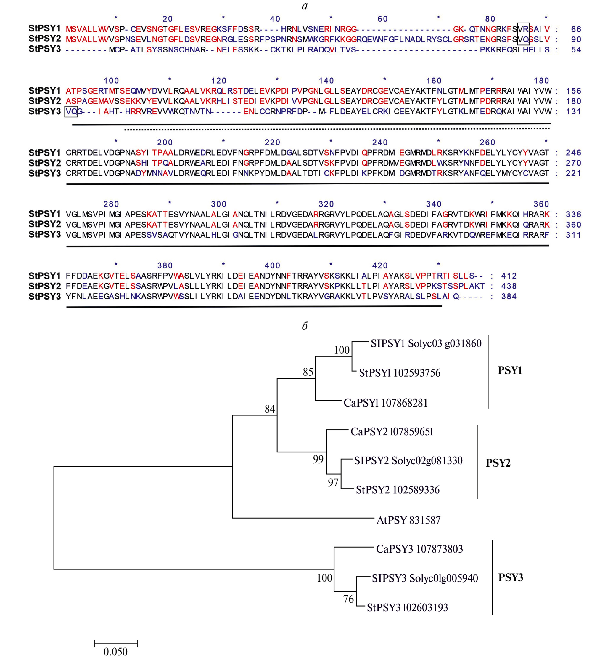 Рис. 1. а – Сравнительное выравнивание аминокислотных последовательностей StPSY1, StPSY2 и StPSY3. Сплошной линией подчеркнут фитоинсинтазный домен PLN02632, прерывистой – начало домена у StPSY3 (NCBI_CDD, https://www.ncbi.nlm.nih.gov/). В рамки взяты предположительные сайты отщепления транзитного пептида. Синим цветом выделены аминокислоты, вариабельные между тремя белками, красным – консервативные у двух белков из трех. б – Филогенетическая дендрограмма, построенная при сравнении 13 аминокислотных последовательностей с использованием метода максимального правдоподобия (Maximum Likelihood, модель JTT, бутстрэп 1000) в программе MEGA7 (https://www.megasoftware.net/). Длина ветвей измеряется количеством замен на сайт, в основании ветвей указан процент деревьев, на которых связанные таксоны сгруппированы вместе. Для анализа использованы последовательности гомологов фитоинсинтаз PSY1, PSY2 и PSY3 представителей Пасленовых – S. tuberosum (St), S. lycopersicum (Sl), Capsicum annuum (Ca), а также модельного вида Двудольных – A. thaliana (At). Номера доступа в NCBI (https://www.ncbi.nlm.nih.gov/) или SolGenomics (https://www.solgenomics.net/) приведены рядом с названием анализируемых белков.