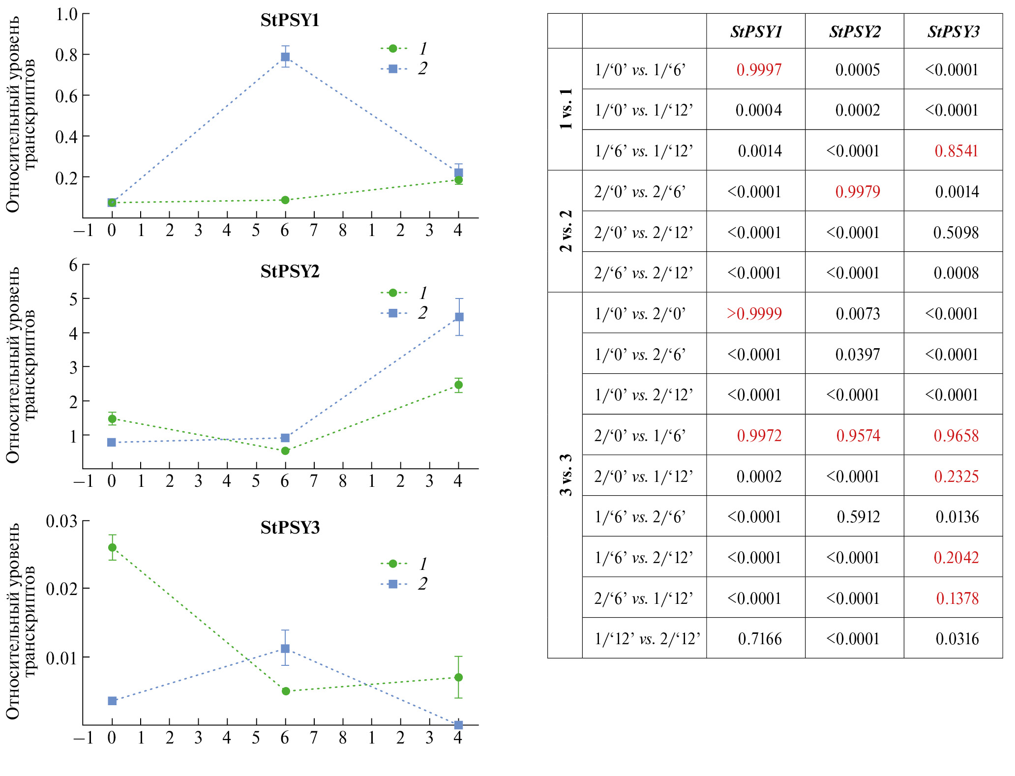 Рис. 2. Уровень экспрессии генов StPSY1 (NCBI Gene ID 102593756), StPSY2 (102589336) и StPSY3 (102603193) в листовой ткани контрольных (1) и опытных (2) проростков [0 ч 23°С (‘0’); 6 ч темновой фазы, 23°С/3°С (‘6’); 4 ч световой фазы 23°С (‘12’)] образцов картофеля сорта Леди Клэр. Дневной и ночной периоды обозначены под графиками белым и серым боксами соответственно. Праймеры: PSY1 (5´-catgctcgatggtgctttgtc-3´ и 5´-gacttcctcaagtccatacgca-3´); PSY2 (5´-aactgagctctgctagtagatg-3´ и 5´-gcactagagatcttgcataagca-3´); PSY3 (5´-gcctagtttagccattcaatagac-3´ и 5´-gcctagagttgatcgaacgattc-3´). Данные нормализованы по двум референсным генам: ef11 (LOC102600998; 5´-attggaaacggatatgctcca-3´ и 5´-tccttacctgaacgcctgtca-3´) и SEC3A (LOC102599118; 5´-gcttgcacacgccatatcaat-3´ и 5´-tggattttaccaccttccgca-3´). Статистическая обработка (one-way ANOVA; “multiple comparisons, corrected with Bonferroni test”) проведена с помощью GraphPad Prism v. 8 (GraphPad Software Inc., США) на основе двух биологических и трех технических повторов (p < 0.05 для значимых различий); в таблице (справа) красным выделены p-value для незначимых различий.