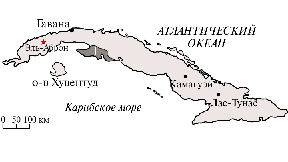Рис. 1. Карта месторасположения пещеры Эль-Аброн на Кубе. Обозначения: 1 – Сьенага-де-Сапата.