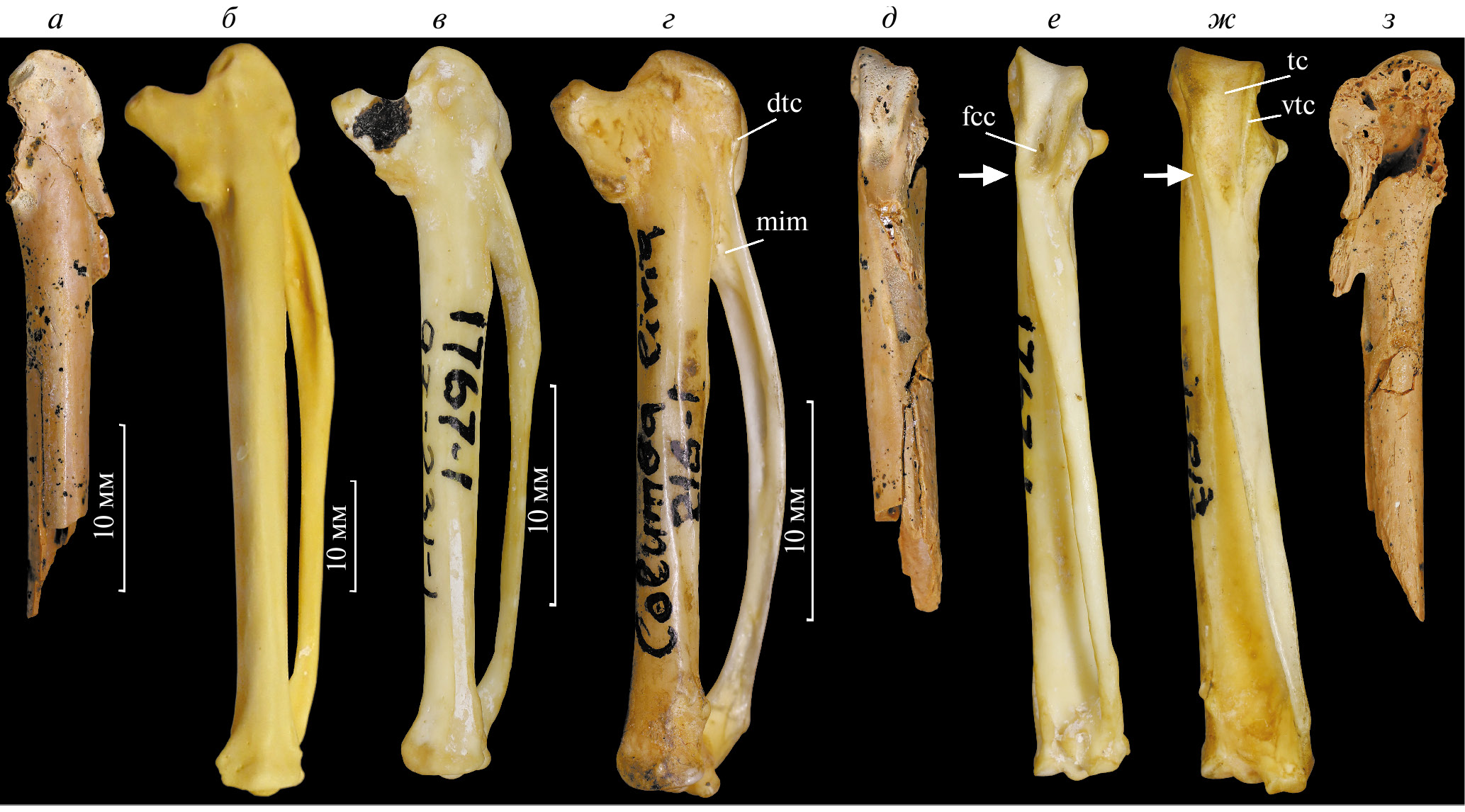 Рис. 2. Карпометакарпус кубинского ары Ara tricolor (Bechstein, 1811) в сравнении с избранными современными Psittacidae и Columbidae: (а), (д), (з) – Ara tricolor, экз. ПИН, № 5781/39; местонахождение: пещера Эль-Аброн, Куба, провинция Пинар-дель-Рио, верхний плейстоцен; (б) – Ara militaris (Linnaeus, 1766), экз. 2006.0311 коллекции Музея естественных наук Барселоны, современный; (в), (е) – Amazona leucocephala (Linnaeus, 1756), экз. остеологической коллекции ПИН РАН, № 97-231-1, современный; (г), (ж) – Columba livia (Gmelin, 1789), экз. остеологической коллекции ПИН РАН, № 91-1-1, современный; (а)–(г) – с дорсальной стороны; (д)–(ж) – с каудальной стороны; (з) – с вентральной стороны. Обозначения: dtc, дорсальный край пястного блока; fcc, fovea carpalis caudalis; mim, малая метакарпалия; tc, пястный блок; vtc, вентральный край пястного блока; стрелкой показана проксимальная часть малой метакарпалии (выпуклая дорсально у Psittacidae; см. текст).