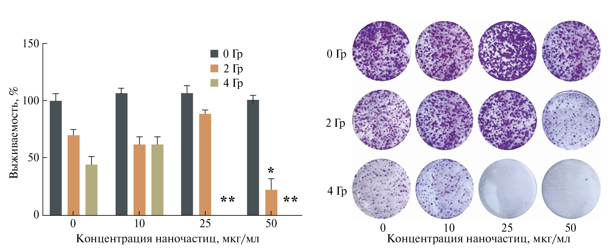 Важно отметить, что наночастицы Au-PEG в исследуемом диапазоне концентраций (от 10 до 50 мкг/мл) не вызывали снижение числа образовавшихся колоний клеток, что подтверждает их высокую биосовместимость. В то же время клетки демонстрировали дозозависимый ответ на облучение пучком протонов, что выражалось в снижении количества образующихся колоний на 25 и 50% для доз 2 и 4 Гр соответственно. Преинкубирование клеток с наночастицами Au-PEG в концентрации 50 мкг/мл с совместным облучением в дозе 2 Гр приводило к четырехкратному снижению числа колоний по сравнению с необлученной группой (рис. 2). Также преинкубирование клеток с наночастицами в концентрациях 25 мкг/мл и 50 мкг/мл и облучении в дозе 4 Гр приводило к полному исчезновению раковых колоний. Таким образом, наночастицы Au-PEG проявляли высокую биосовместимость и радиосенсибилизирующее действие при облучении пучком протонов в дозе 2–4 Гр in vitro.