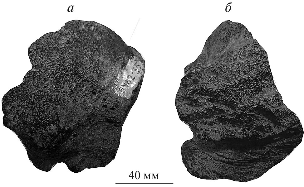 Рис. 3. Kurdalagonus maicopicus (Spasskii, 1951), экз. ПИН, №5462/35, фрагмент правой части мозговой коробки черепа (верхняя часть чешуйчатой кости); фрагмент черепа; Россия, Республика Адыгея, Майкопский р-н, долина р. Фортепьянки, местонахождение Фортепьянка 2; верхи среднего миоцена, средний сармат, блиновская свита: а – вид сбоку, б – вид сзади.