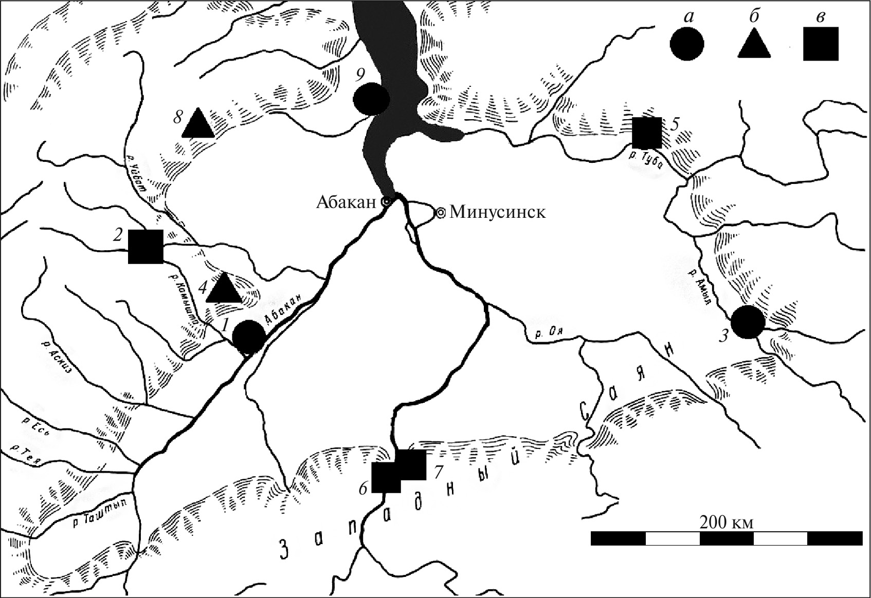 Рис. 1. Основные местонахождения крупных млекопитающих позднего плейстоцена Южно-Минусинской впадины: Типы тафоценозов: a. аллювиальные; b. пещерные; c. палеолитические стоянки. Местонахождения: 1. Уйтаг; 2. Узунжул; 3. Верхний Кужебар; 4. Пещера Фанатиков; 5. Ирба 2; 6. Майна, Уй 1 и 2; 7. Голубая и Сизая; 8. Пещера Заповедная; 9. Мохово
