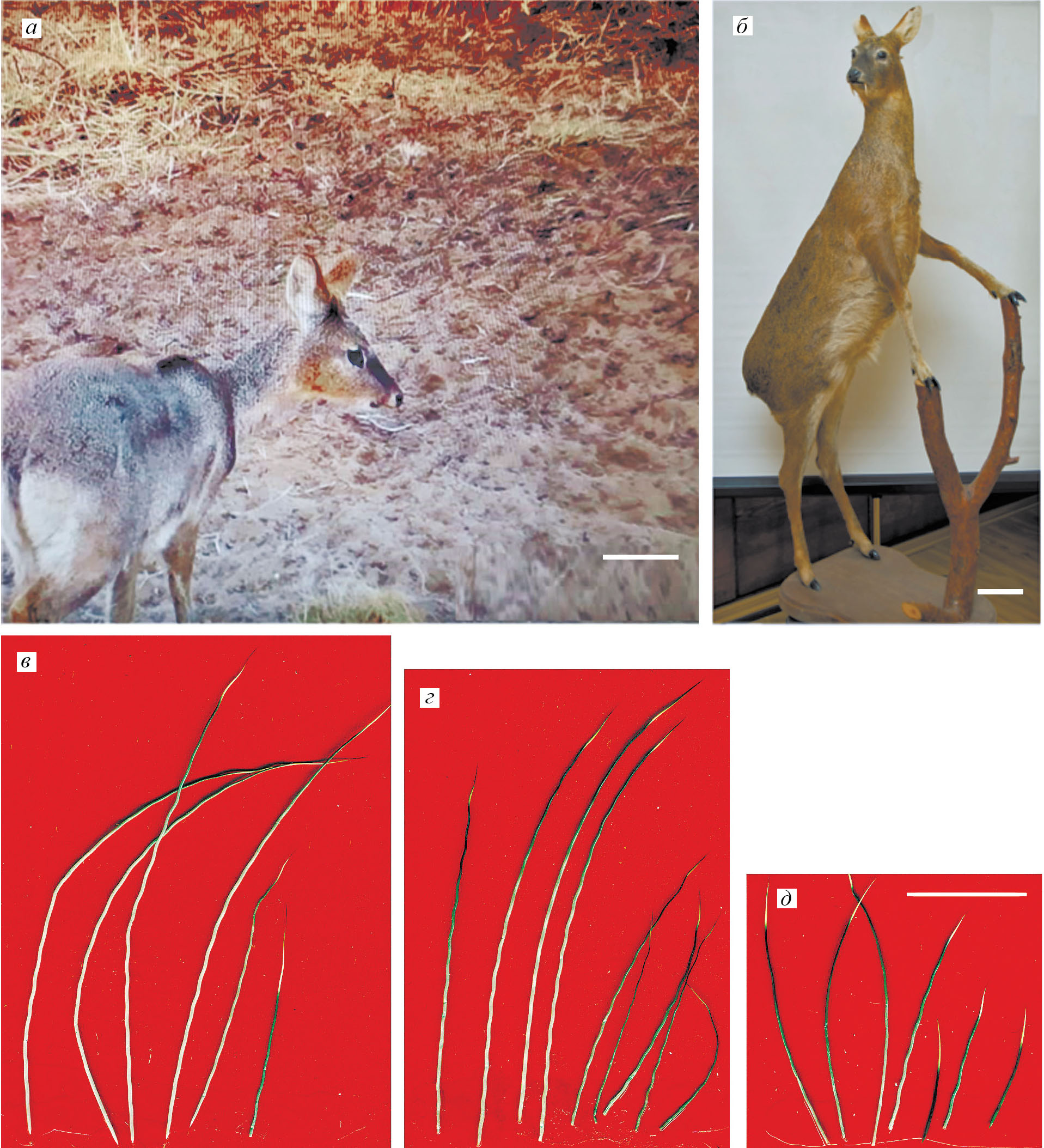 Рис. 1. Внешний вид взрослых особей Hydropotes inermis и профиль волос. (а) – снимок получен с помощью фотоловушки (апрель 2019 г.) в природном парке краевого значения “Хасанский” Роспотребнадзора (г. Владивосток). Фото любезно предоставлено Д.В. Панкратовым и Ю.А. Дарманом. (б) – чучело из зоологической экспозиции НИИ эпидемиологии и микробиологии им. Г.П. Сомова Роспотребнадзора; колл. номер FE-5913. Сканированное изображение (HP Laser Jet 1320, 300 dpi) волос: (в) – подхвостовые, (г) – спины, (д) – груди. Хорошо заметна узловатость и зонарная окраска волос. Масштаб: а, б –10 см; в–д – 10 мм.