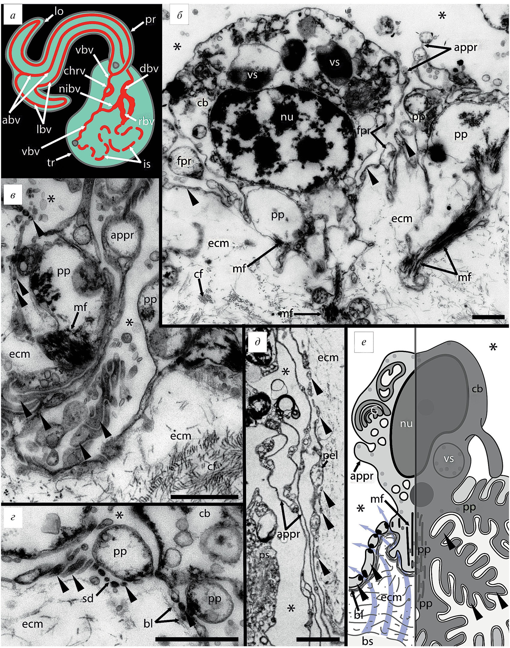Обозначения: (abv) – аксиальный кровеносный сосуд, (appr) – апикальный вырост, (bl) – базальная пластинка, (bs) – полость сосуда, (cb) – клеточное тело, (сf) – коллагеновые филаменты, (chrv) – кольцевой сосуд щетинок, (dbv) – дорсальный кровеносный сосуд, (ecm) – внеклеточный матрикс, (G) – комплекс Гольджи, (is) – околокишечный синус, (lbv) – латеральный кровеносный сосуд, (lo) – лопасть хобота, (mf) – миофиламенты, (nu) – ядро, (nibv) – нервно-кишечный кровеносный сосуд, (nu) – ядро, (pp) – первичный отросток подоцита, (pr) – хобот, (rbv) – кольцевой кровеносный сосуд, (tr) – туловище, (sd) – щелевая диафрагма, (vbv) – вентральный кровеносный сосуд, (vs) – везикулы. Звездочки (*) обозначают целомическую полость, наконечники стрелок указывают на цитоподии подоцитов. Масштаб – 1 мкм.