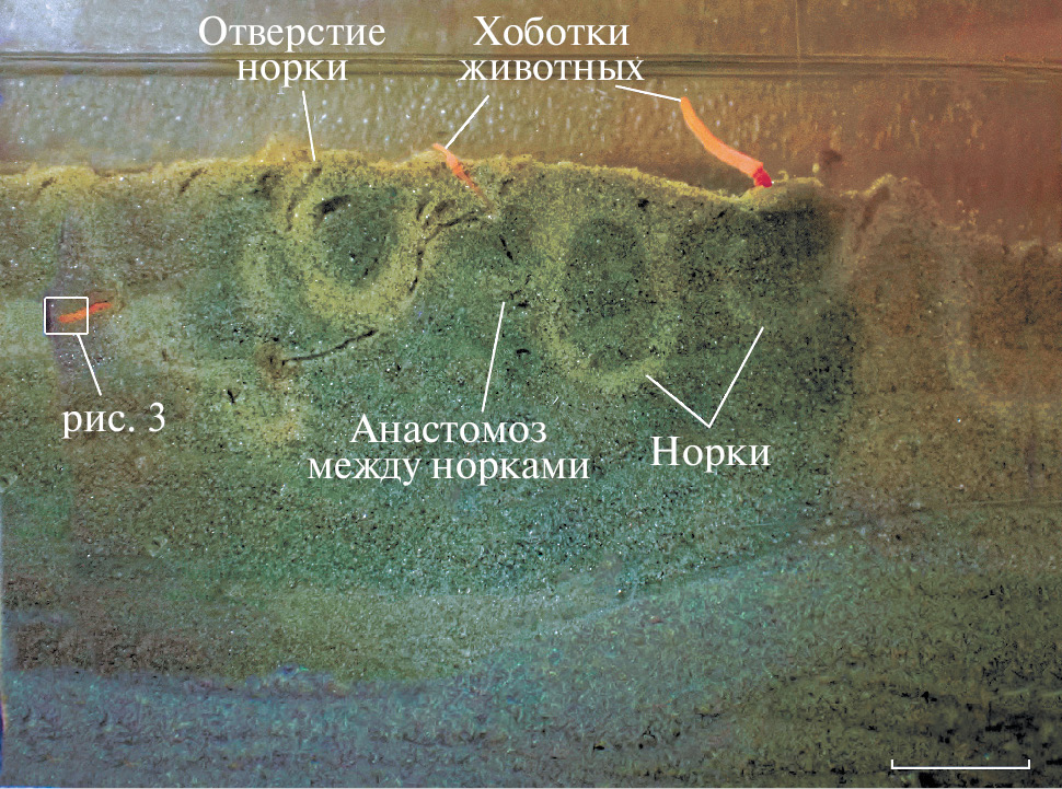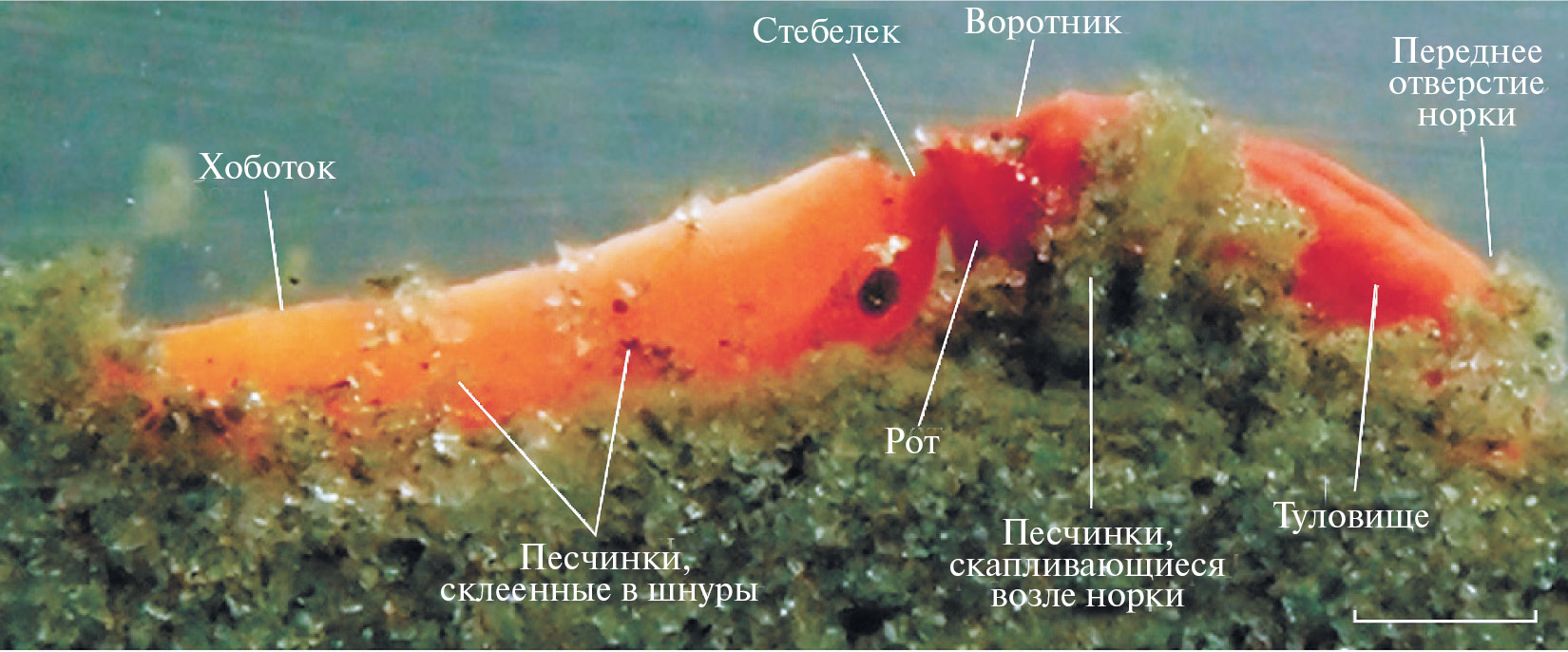 Меняя направление движения, S. mereschkowskii строит в толще осадка U-образные норки (рис. 2) с двумя отверстиями — передним и задним. Песчаные стенки норок не осыпаются, так как укреплены слизью. Видеорегистрация позволяет установить, что строительство одной U-образной норки занимает около 1,5 часов. Построенная норка сохраняется в течение 5–8 дней. Высота норок от отверстий до дна U-образного изгиба составляет 5–8 см, а ширина ходов соответствует диаметру хоботка S. mereschkowskii, т.е. составляет 3–5 мм, в зависимости от размера особи. Через переднее отверстие U-образной норки животное высовывает хоботок для сбора пищевых частиц с поверхности осадка. Через заднее отверстие норки на поверхность грунта выбрасываются фекальные шнуры. Нередко норка имеет не одно, а несколько передних отверстий. Помимо U-образных норок S. mereschkowskii строят в толще осадка спиральные ходы и боковые ответвления. Благодаря образованию боковых ходов, возникают анастомозы, через которые черви способны проникать в норки, построенные соседними особями (рис. 2). Таким образом, можно предполагать, что в естественных условиях S. mereschkowskii формирует трехмерную сеть ходов, пронизывающую верхний слой осадка по меньшей мере до глубины 8 см. Это обеспечивает биотурбацию и аэрирование верхних слоев грунта.
