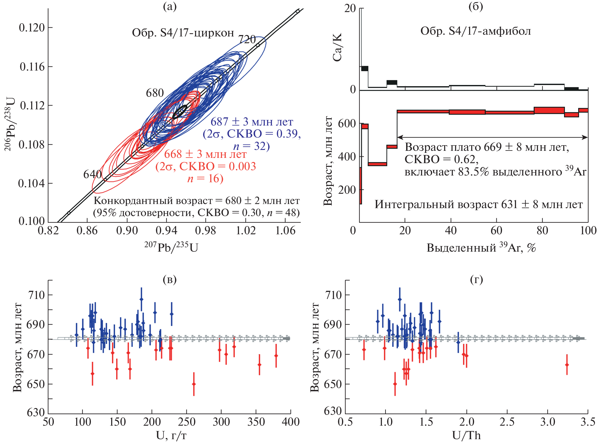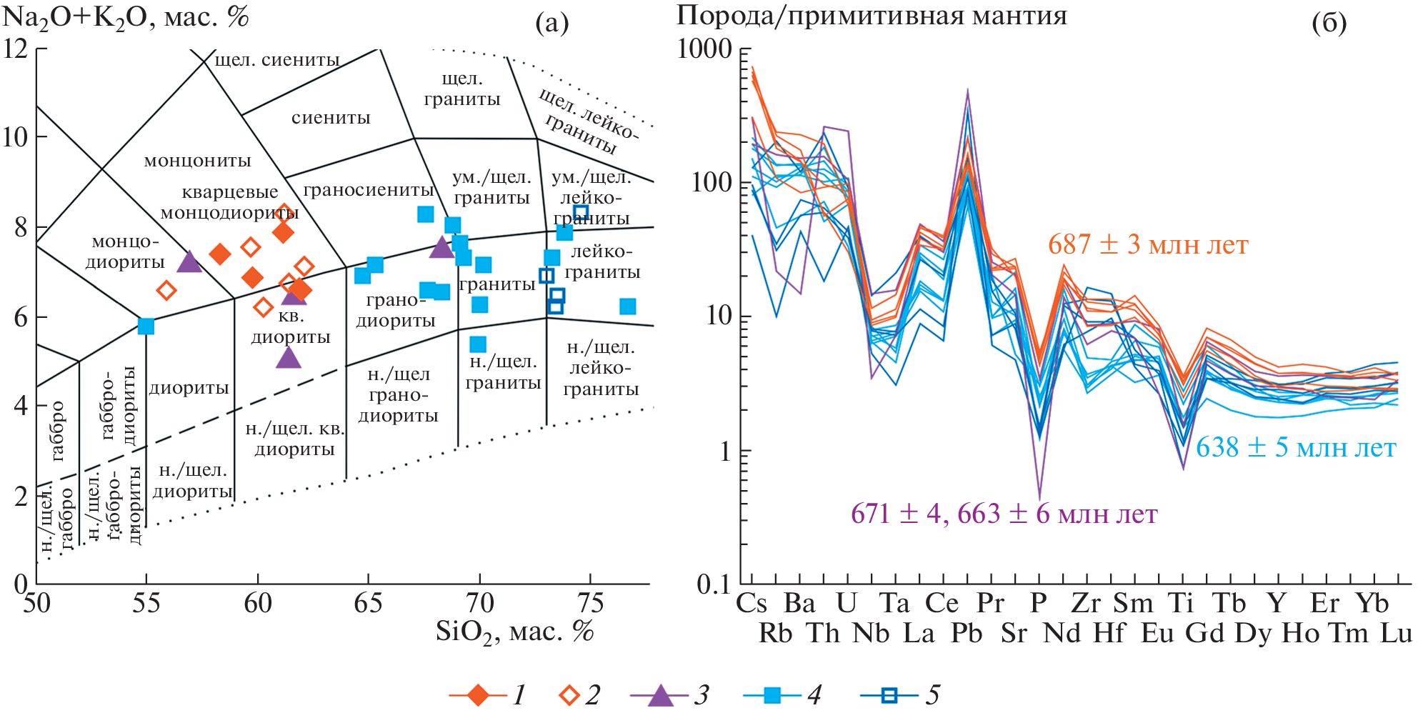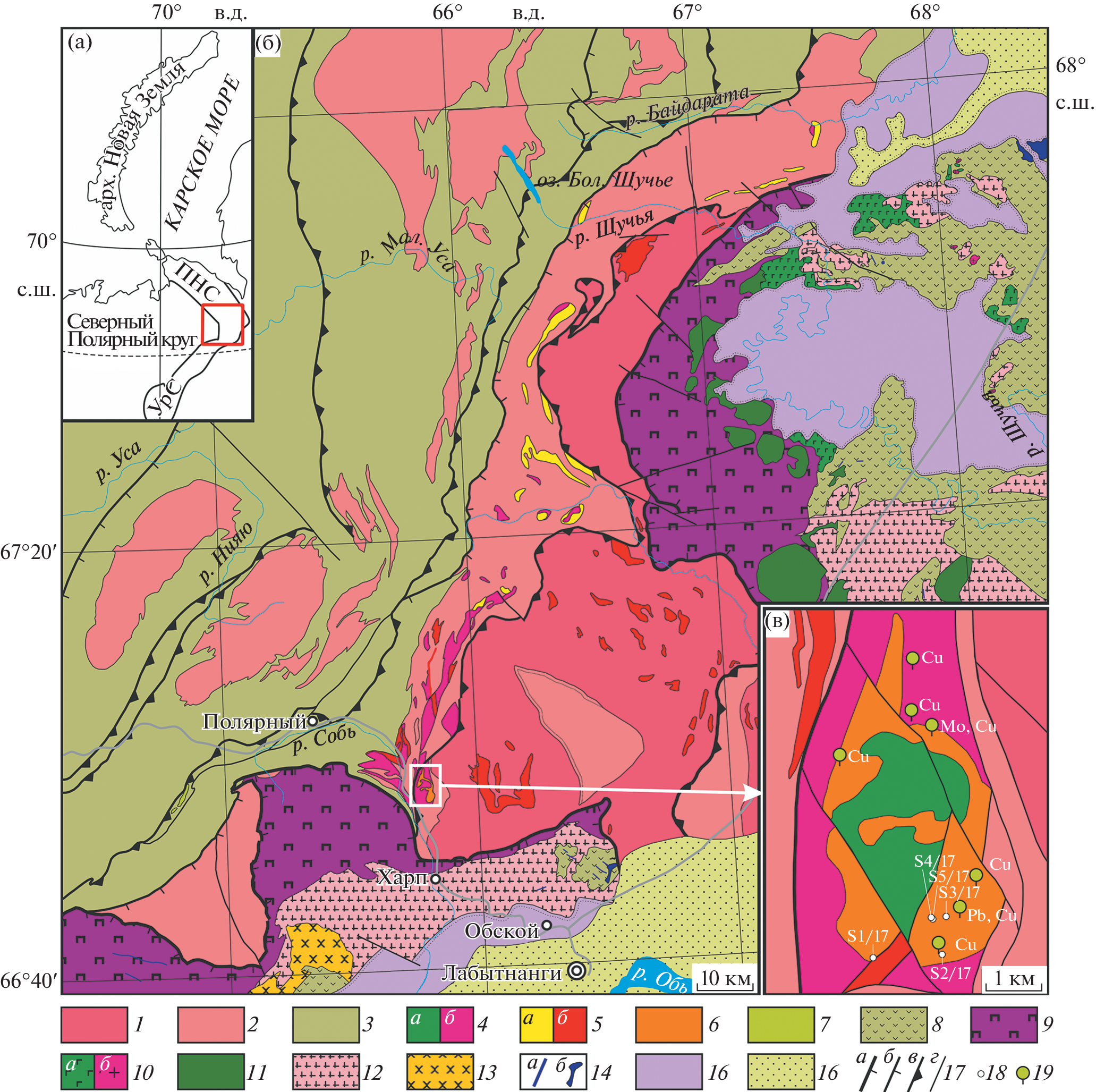 In the Polar Urals, there are few small granitoid intrusions (Yarkeu, Yayu and Pogurei complexes), which are usually associated with the Ural collision. Their Carboniferous-Early Permian age, in most cases, is based on methodologically outdated K/Ar dates, and is also assumed from field geological relationships. We have studied the monzonitoids of the Yarkeu petrotypical pluton, one of the largest such intrusions, and for the first time obtained Late Precambrian U–Pb LA-ICP-MS (zircon) and 40Ar/39Ar (amphibole) ages of 687 ± 3, 669 ± 8 Ma years, respectively. Water-saturated fluid regime (presence of magmatic amphibole and high water content in it, 4.5–5.6 wt %,), hypabyssal formation conditions (P = 2.1–3.5 kbar, T = 871–960°C), features of the chemical composition of monzonitoids (low TiO2 (0.6–0.8 wt %) and CaO (3.6–6.3 wt %) contents, high Al2O3 (16.6–18.0 wt %) and K2O (1.7–4.6 wt %), enrichment in large-ion lithophile elements relatively high field strength and rare earth elements, Ta-Nb minimum and Pb maximum), as well as metallogenic specialization in Cu and Mo (±Pb, Hg, Au), indicate the formation of the rocks of the Yarkeu complex in a subuction-related setting in a fairly thick continental crust. Isotopic clocks in these monzonitoids captured two stages of the assembly of the Pangea supercontinent: the earliest stage in the Late Precambrian, when monzonitoids were formed on the active Bolshezemel margin of Arctida, and one of the final stages in the Middle to Late Carboniferous, when the rocks underwent metamorphism due to the closure of the Paleo-Ural ocean and the onset of collision between Arkt-Laurussia and Siberia.