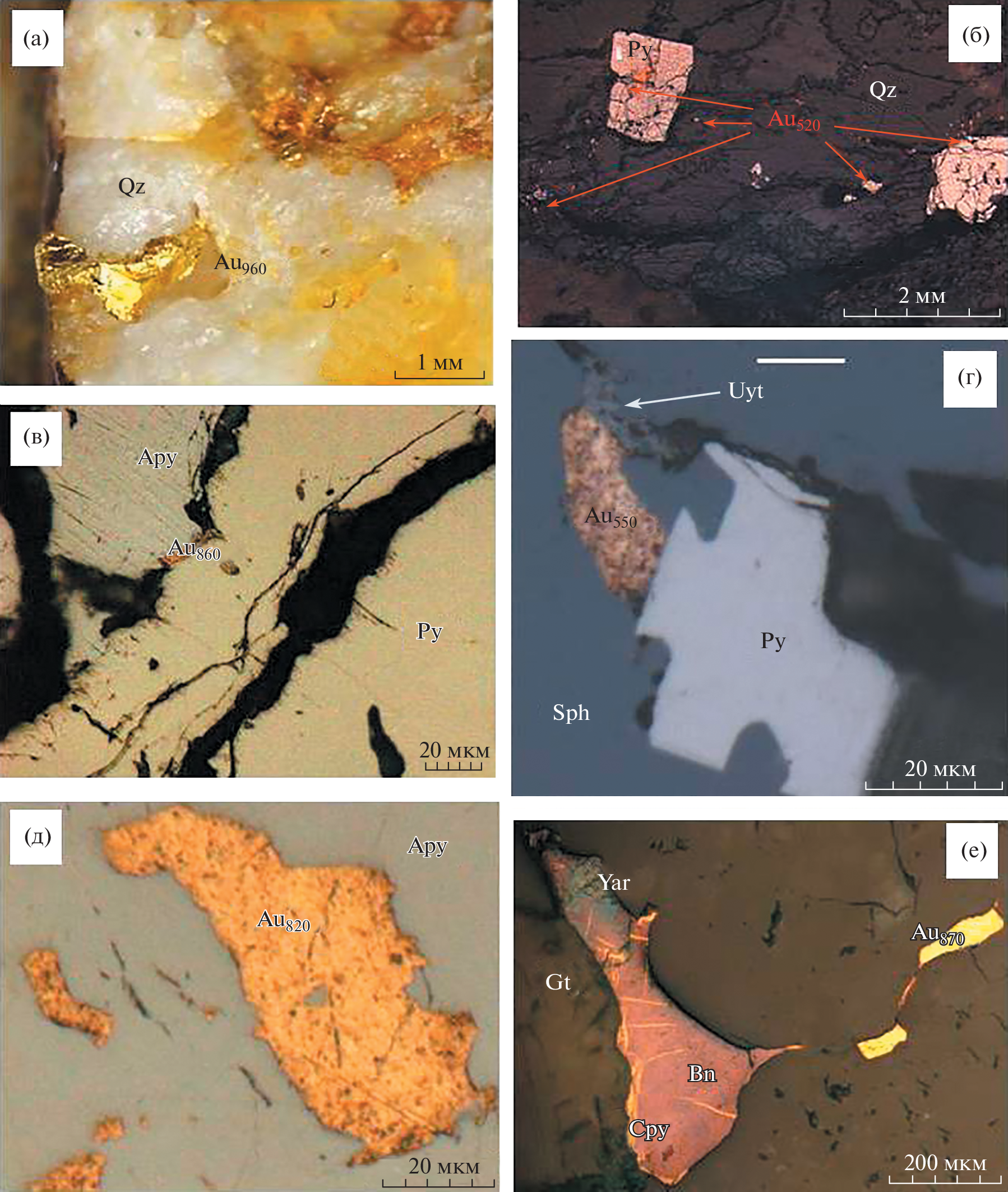 For the first time, based on the data of the study of fluid inclusions, the PTX parameters of the formation of gold mineralization of the Taimyr-Severozemelsky orogen were established. The temperature of formation of gold ores covers the range from 310 to 105°C, the pressure was not lower than 110–96 MPa. The ore-forming fluids were characterized by NaCl + KCl + H2O + CO2 + CH4 + N2 composition and salinity up to 9.7 wt. % in equiv. NaCl. The composition of native gold (fineness varies from 960 to 550‰) and minerals of productive mineral associations has been determined. Ore-forming fluids of gold-sulfide-quartz ore occurrences of the accretionary Schrenk-Fadeevskaya zone (Yasnenskoye and Malinovskoye in North-East Taimyr) are more oxidized and less saline compared to the gold-quartz occurrences of the orogenic type of the Mininsko-Bolshevitskaya myogeoclinal zone (Nizhnelitkenskoye, Vidimoe, Nerpichye).