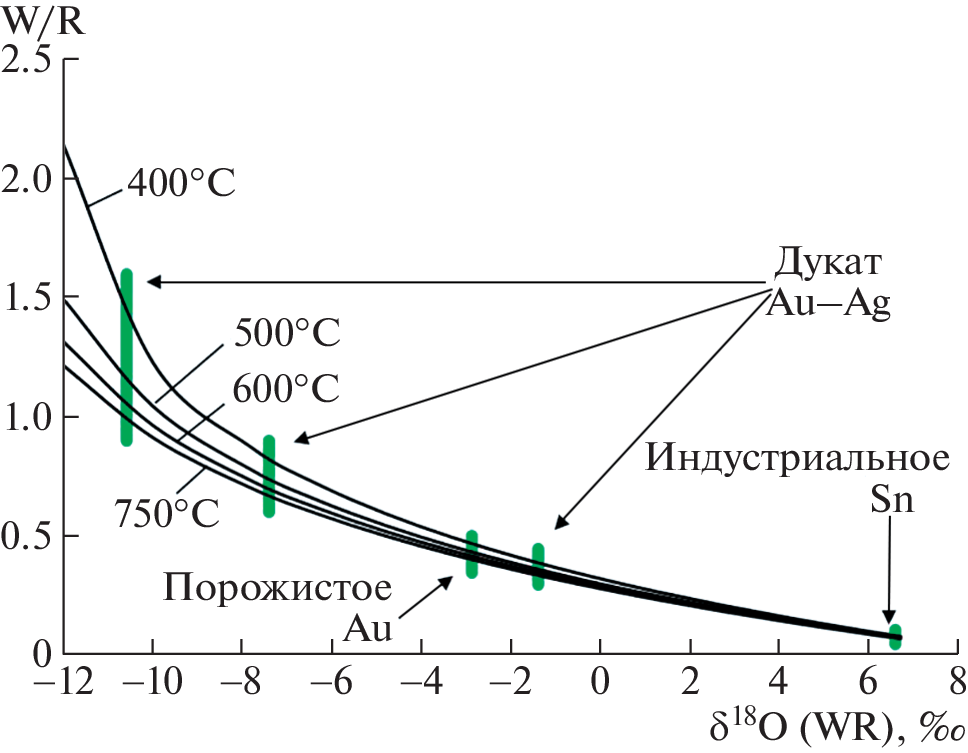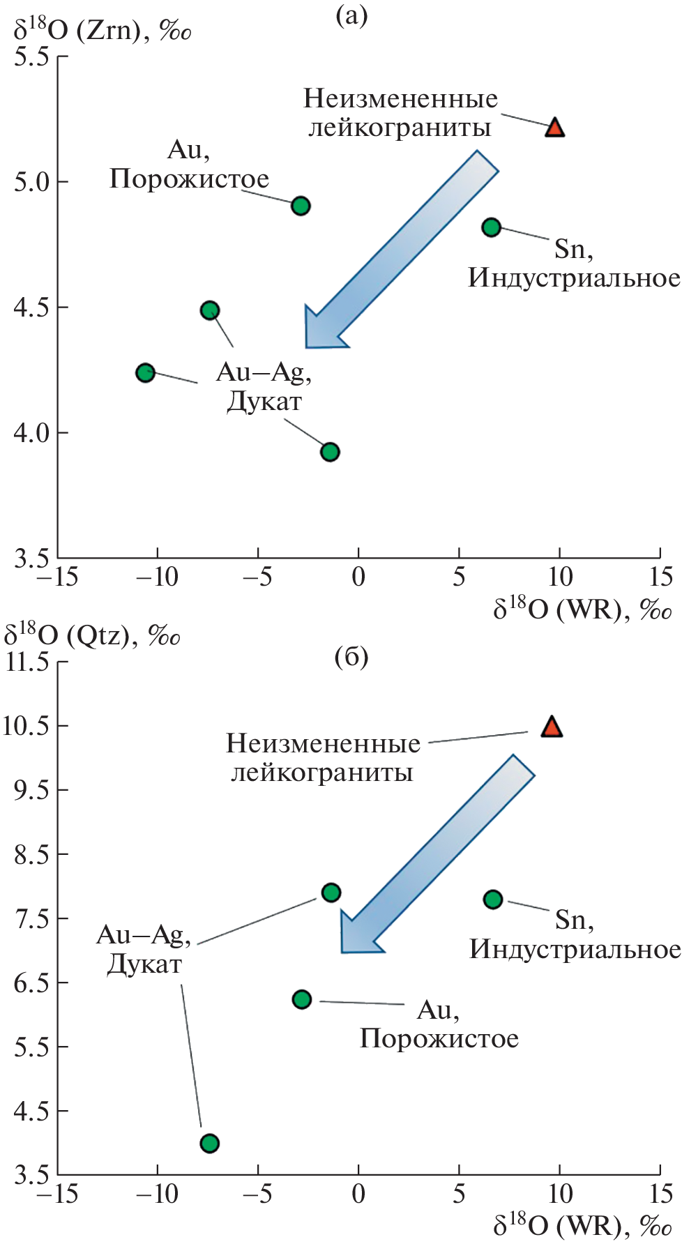 Изучен изотопный состав кислорода минералов (Qtz, Zrn, Kfs) и валовых проб позднемеловых порфировых лейкогранитов Омсукчанского прогиба и прилегающих территорий, в пределах которых развито Au–Ag-, Sn- и Sn-полиметаллическое оруденение. Величины δ18О валовых проб лейкогранитов возрастают от –10.6‰ в районе Дукатского Au–Ag-рудного поля до +9.7‰ в районе других рудоносных областей. Изотопно-легкие характеристики пород являются атрибутом полевых шпатов и отвечают изотопному равновесию с флюидом метеорного происхождения (δ18О = –15‰) в широком интервале Т при ограниченных соотношениях флюид–порода (W/R от 0.9–1.6 до 0.3–0.1). Величины δ18О кварца и циркона также изменены в процессе флюидного воздействия, но частично: в первом случае, вероятно, по механизму диффузии, а во втором – по механизму растворения-кристаллизации.