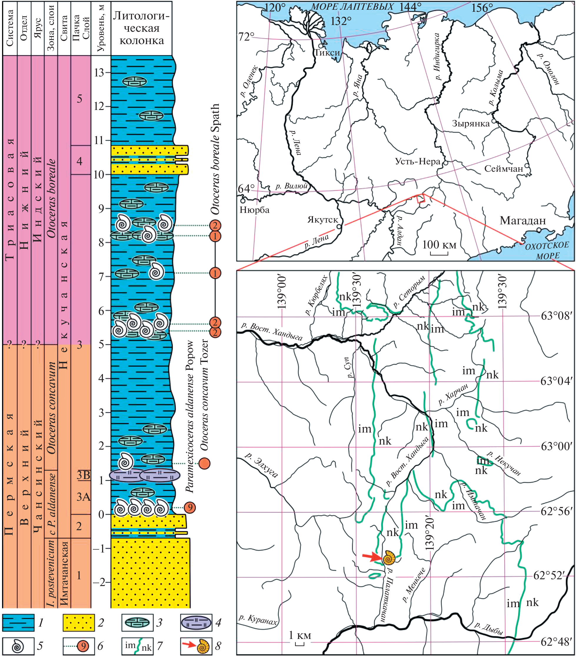 Ammonoids Paramexicoceras aldanense Popow were found at the base of the Nekuchan Formation (upper part of the Changhsingian Stage) in the Dyba River basin, South Verkhoyanie. The first discovery of goniatites in the Upper Permian of Northeast Asia made it possible to clarify the biostratigraphic subdivision of the boundary Permian-Triassic deposits. The Otoceras concavum Zone in its lower part is reduced due to the establishment of the Paramexicoceras aldanense Beds at the base of the Nekuchanian Regional Stage. The data obtained indicate that the genus Paramexicoceras, previously considered long-lived, belongs to the youngest and short-lived taxa of the Cyclolobidae, representing the terminal phase of the goniatite development. This record made it possible to compare the base of the Nekuchanian Regional Stage in South Verkhoyanie with the upper part of the Foldvik Creek Group in East Greenland.