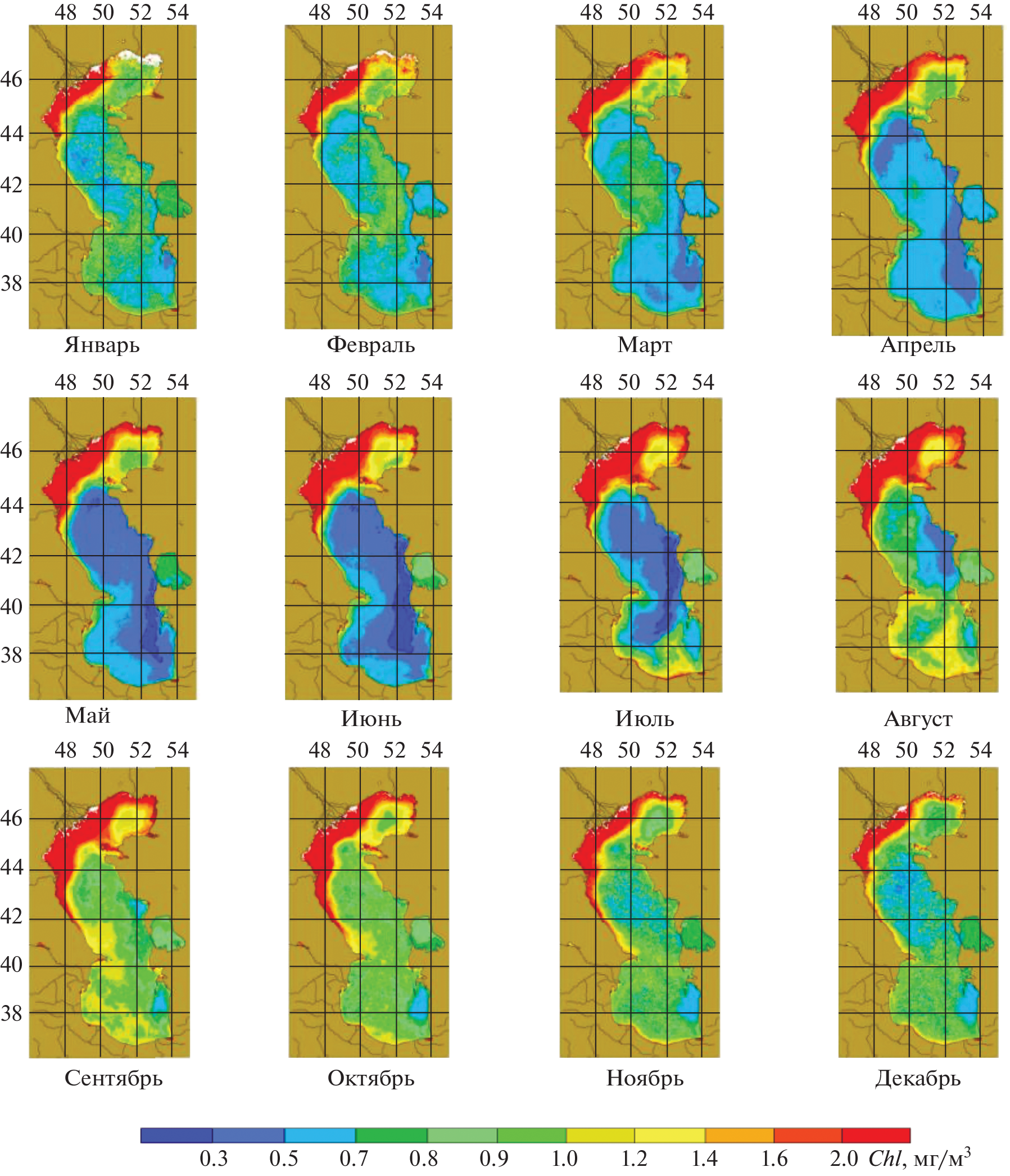 The patterns of seasonal and long-term variability of phytoplankton in the Caspian Sea have been studied using SeaWiFS and MODIS-Aqua scanners. Chlorophyll “a” concentration (CHL) in the Caspian Sea were calculated by the regional algorithm developed using an array of in situ measurements in different seasons of the year. Maps of the average monthly CHL values over a twenty-two-year period and seasonal variability diagrams were constructed for the Northern, Middle and Southern Caspian Sea. The features of seasonal variability of phytoplankton are analyzed using CHL data. The fundamental differences were mentioned in seasonal variability of phytoplankton in the Northern, Caspian Middle and Southern Caspian. The regularities of the spatial dynamics of CHL throughout the Sea, resulting from seasonal succession of phytoplankton have been studied. The years with significant deviations of the seasonal dynamics of CHL from the average climatic one was identified.