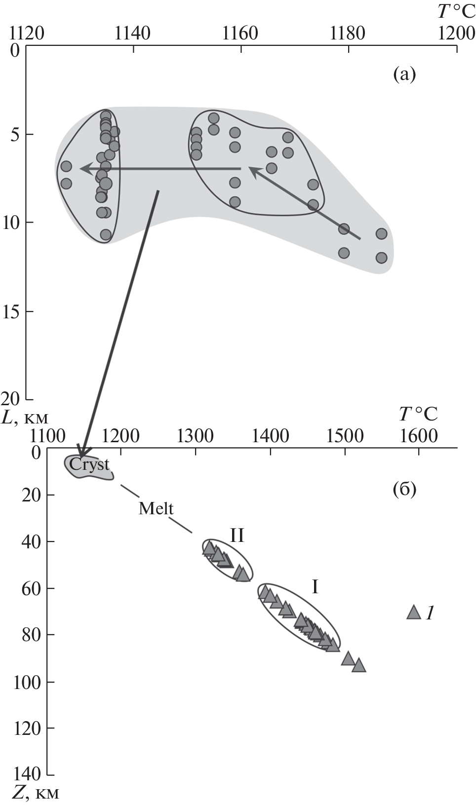 Melt inclusions in the minerals of a sample from a dolerite dike of the Vilyui-Markha dike swarm, located on the northwestern shoulder of the Vilyui paleorift, have been studied. Data on the composition of homogeneous glasses of melt inclusions in minerals made it possible to establish the PT-parameters of mantle sources of initial deep melts responsible for the formation of gabbro-dolerites of the Vilyui paleorift. Two levels of generation of initial melts for dolerites have been established: in the intervals of 95–65 km at 1480–1400°C and 55–45 km at 1360–1320°C. The presence of two intermediate chambers in the crust, where melts crystallized, was identified at depths of about 12 and 9–4 km with a decrease in temperature to 1175–1125°С. The two-level arrangement of magma generation centers, as well as the heterogeneity of the chemical composition of the studied minerals, makes it possible to explain the presence of two pulses of Devonian basic magmatism.