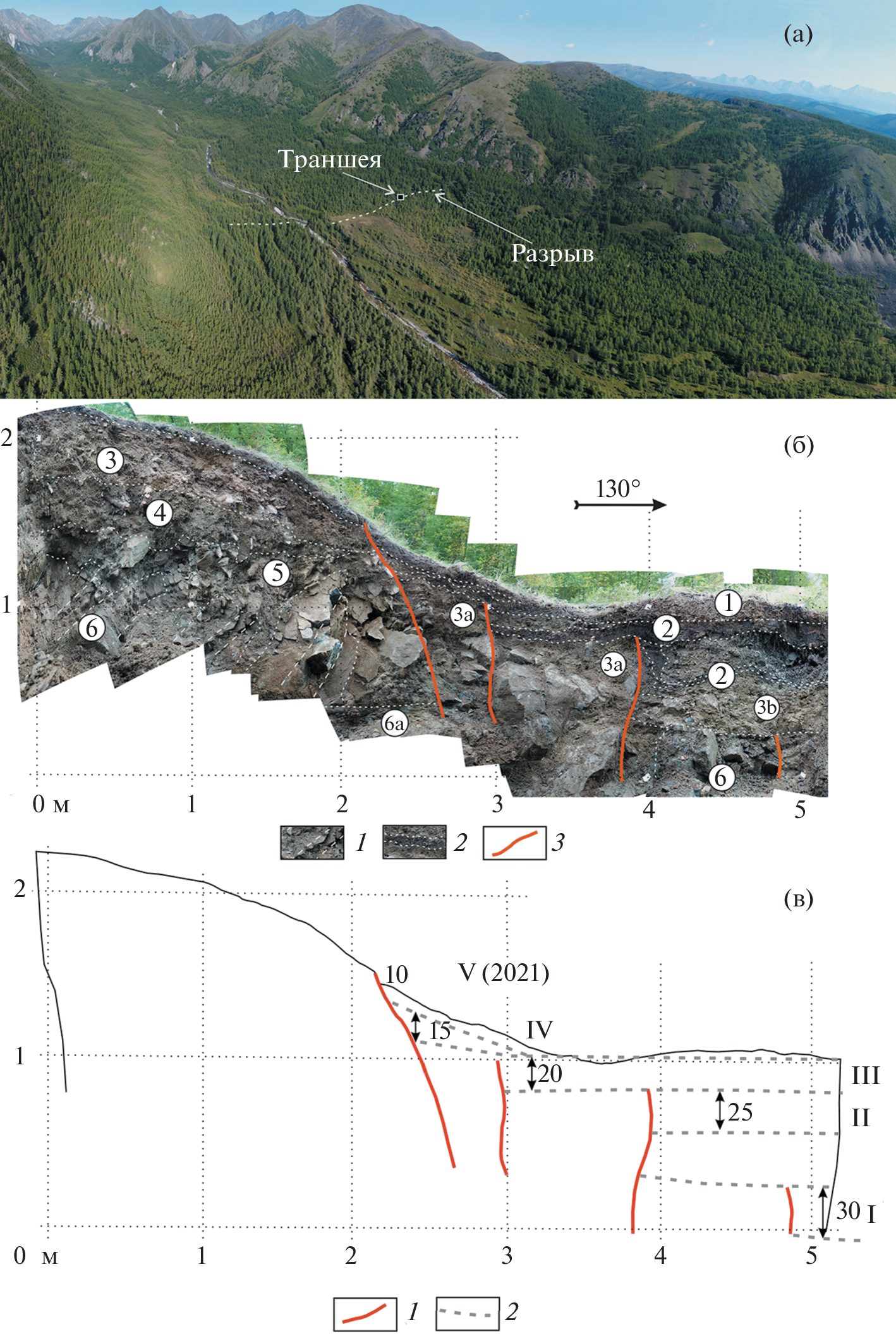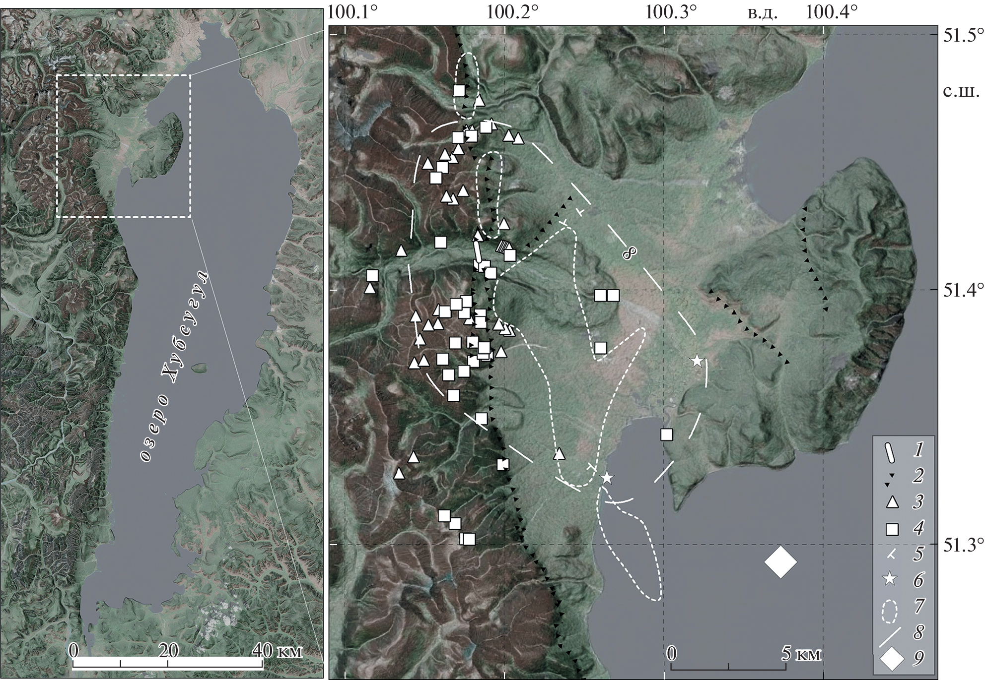 Изучены и закартированы геологические эффекты Хубсугульского землетрясения 12.01.2021 г. с Mw = 6.7, ставшего сильнейшем в Прихубсугулье на инструментальном этапе сейсмологических наблюдений. С использованием шкалы ESI-2007 оконтурена эпицентральная зона с интенсивностью 8 баллов. Выход очага землетрясения на поверхность представлен правосторонним сбросо-сдвигом с амплитудой смещения до 20 см, обновившим позднеголоценовый тектонический уступ в западном борту Хубсугульской рифтовой впадины. Динамика разрывообразования в позднем голоцене свидетельствует о постепенном разрастании впадины за счет деструкции прилегающего горного массива. Данные спутниковой интерферометрии и сейсмологических наблюдений хорошо согласуются с результатами полевых исследований, что позволяет рассматривать выделенную область максимальных сотрясений в качестве проекции верхней части очаговой зоны на поверхность.
