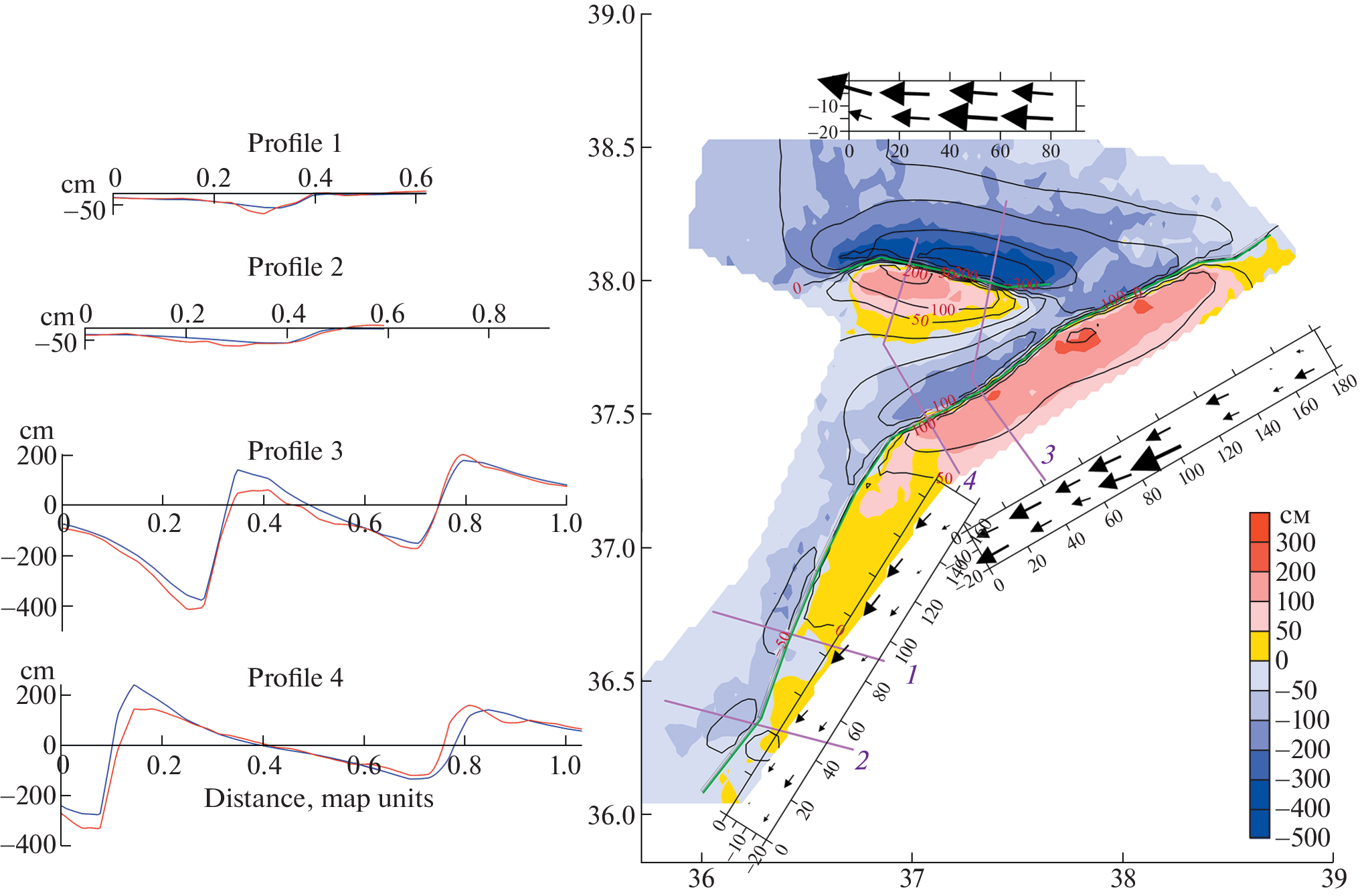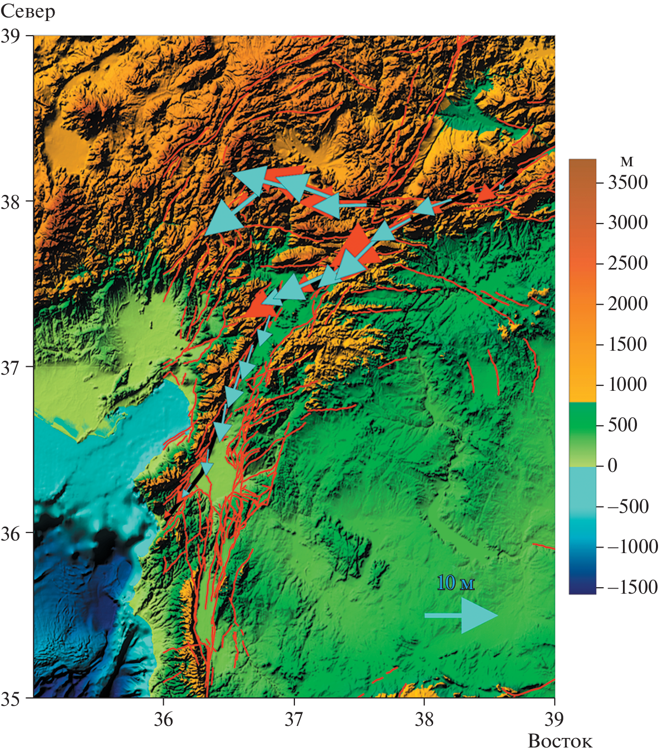Satellite radar interferometry data made it possible to clearly map two faults, shear displacements along which caused catastrophic earthquakes on February 06, 2023 in Turkey. According to satellite data, the relative displacements of the sides of the East Anatolian Fault Zone (EAFZ), to which the first event with a magnitude of Mw 7.8 was associated, exceeded 5 m in the central segment. The rupture surface extends from the area of the Doğanyol-Sivris of 24.01.2020 Mw 6.7 earthquake in the north to the Mediterranean coast in the south, where the earthquake Mw 6.3 occurred on 20.02.2023. The second event of Mw 7.5 is associated with the Surgü-Çardak fault, and the relative displacements of its sides, according to satellite data, exceeded 7 m. The obtained displacement fields of the Earth’s surface were used to construct a model of the seismic rupture. The model is based on the solution [5], which defines displacements on the surface of a spherically stratified planet as a result of dip and strike displacements on a rectangular rupture located inside the sphere. Ignoring the spherical stratification of the planet leads to errors of up to 20%, especially in the presence of a large shear component [5]. Also, an error is introduced by ignoring sphericity when using the solution obtained for an elastic homogeneous half-space [6], as the US Geological Survey (USGS) did when building seismic rupture models for earthquakes in Turkey in 2023. The difference of our model is the detailed consideration of the fault geometry. For this purpose, the faults were approximated by 19 planes along the strike, divided into two levels along the dip. In the built model, shear displacements in the central segment of the EAFZ reached 12.7 m. In the southern segment of this rupture, the displacements are substantially smaller. It should be emphasized that we registered the displacements for the period from January 29 to February 10, 2023, i.e. together with coseismic ones, they also include postseismic displacements for 4 days after the main seismic events. The displacements on the rupture surface along the Surgü-Çardak fault, where an Mw 7.5 earthquake occurred, reached 10 m. The obtained results demonstrate, in particular, the efficiency of application of satellite radar interferometry in the operative study of catastrophic geodynamic phenomena and processes.