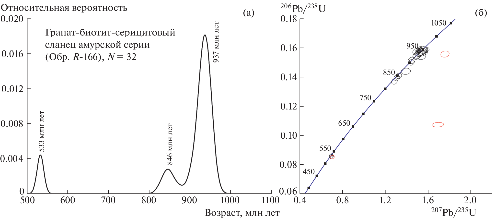 The paper presents the results of U–Th–Pb geochronological studies of zircons from metamorphic rocks of the Amur group of the Synchyga Block of the Jiamusi continental massif. It is shown that the garnet-biotite-sericite schists of the Amur group have a primary sedimentary origin. The lower depositional age of the protolith can be determined by the age of the youngest zircons from group with Neoproterozoic ages ~832 Ma. The upper age boundary of protolith, apparently, corresponds to the age of metamorphic zircons ~533 Ma. Thus, the schists of the Amur group of the Synchyga Block are of Neoproterozoic in age rather than Early Precambrian, as was accepted earlier.