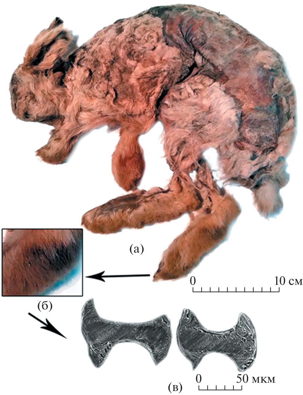 Until recently, only the bone remains of the Don hares, extinct in the Holocene, were known. For the first time, the mummy of an adult hare, identified as the Don hare, has made it possible to expand the understanding of this species and its morphological adaptations to living conditions in the Arctic steppes of the Pleistocene of Yakutia: large body length, short ears and feet, powerful locomotor apparatus of the hind limbs, hard hair brushes on the feet, excellent heat-shielding properties of the fur, including the specific microstructure of the hairs.