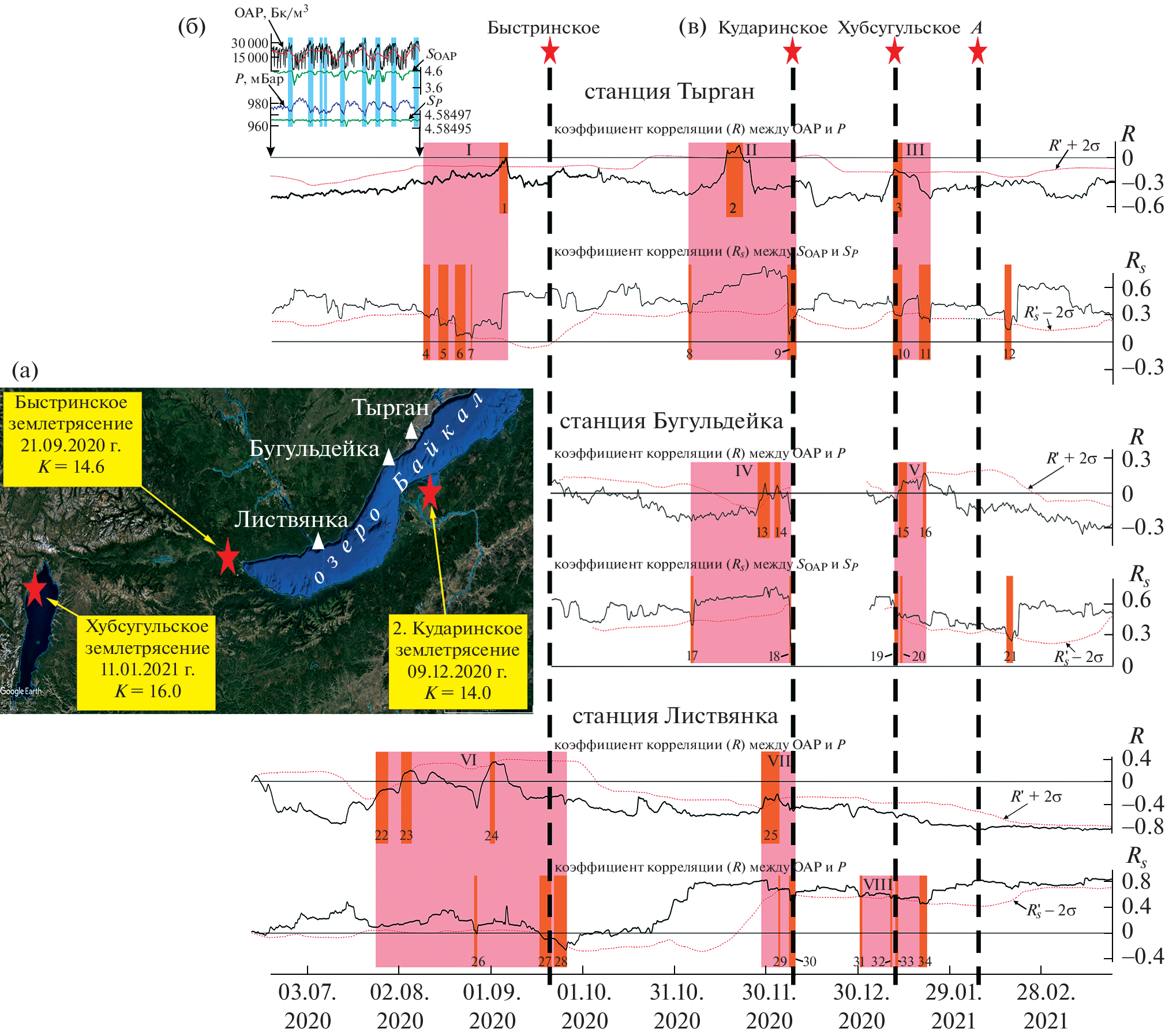 Проведено сопоставление временных вариаций атмосферного давления и концентрации почвенного радона, измеренной в рыхлых отложениях на трех станциях мониторинга в Прибайкалье для периода проявления достаточно сильных землетрясений – Быстринского (21.09.2020 г., K = 14.6), Кударинского (09.12.2020 г., K = 14.0) и Хубсугульского (11.01.2021г., K = 16.0). Использованная система эманационного мониторинга позволила установить, что выход радона из недр контролируется вариациями атмосферного давления. Нарушения этой зависимости, впервые выявленные в ходе формализованного статистического анализа, имеют место для каждой из изученных сейсмических активизаций. Они связаны с процессом подготовки землетрясения, что при расширении сети мониторинга открывает реальные возможности для разработки эманационного подхода к среднесрочному прогнозированию.