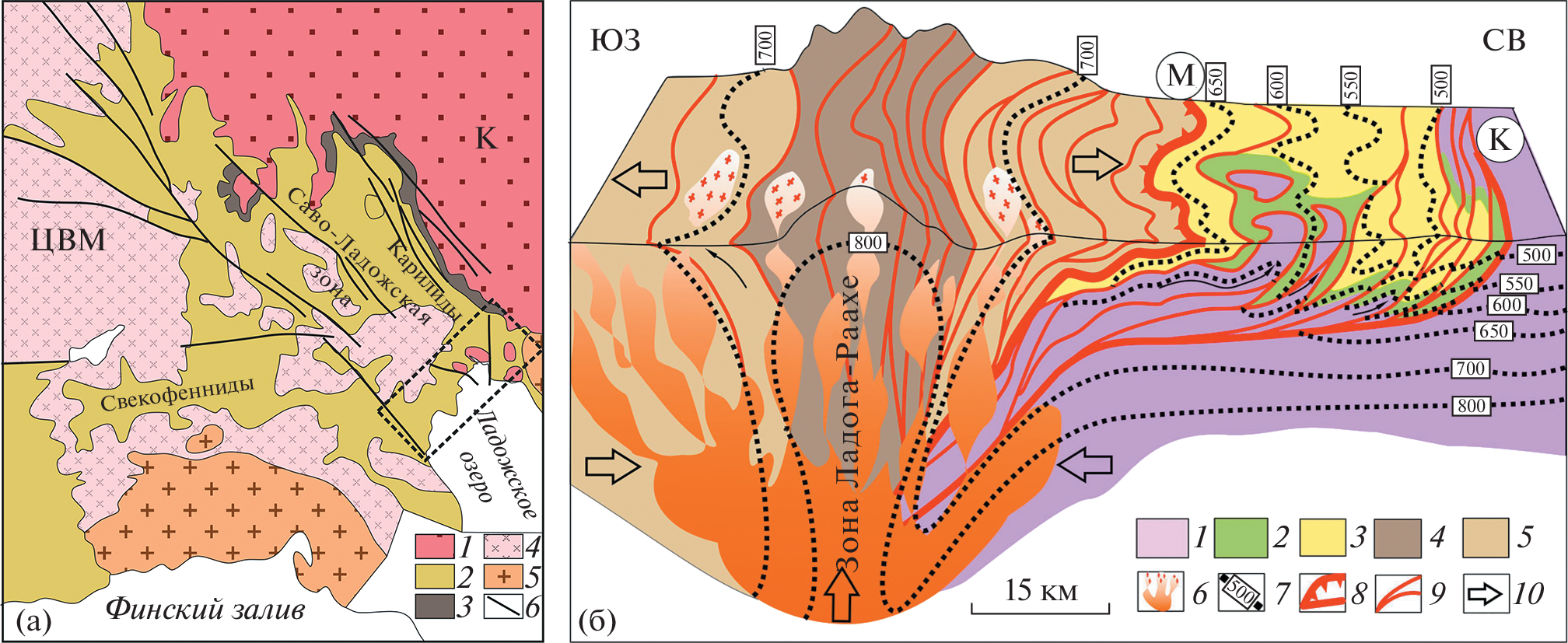 Elements of the structure of the Svecokarelian pericratonic zone of the Karelian Massif (SE Fennoscandia), formed after the main events of the Svekofennian tectogenesis, have been identified and characterized. Dated age intervals of the orogenic stage and post-orogenic extensional collapse manifestation, determined the depth levels of the corresponding structures and visualized the scheme of differentiated exhumation of the deep complexes of the post-Proterozoic Savo-Ladoga movable zone. Approximate estimations of exhumation rates of deep material at certain stages of the Precambrian evolution of this zone are given.