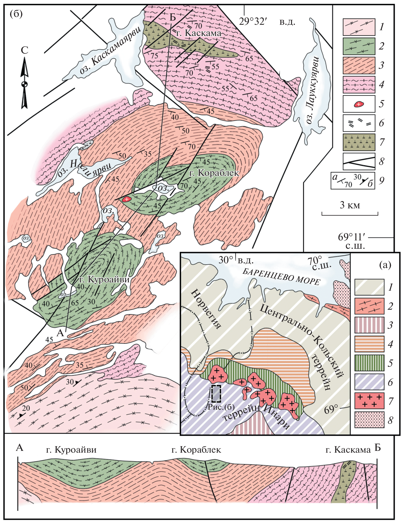 New data of U-Th-Pb age (SIMS) of magmatic (T = 730–744°C) zircon from intermediate and acid metavolcanics (1923–1926 Ma) of the supracrustal complex in the Kaskama block of the Inari terrane (north-west of the Kola-Norwegian region of the Fennoscandian shield) were obtained, which makes it possible to attribute them to the Kalevian suprahorizon. The source of primary melts of metariodacites and metabasaltes in the Kaskama block was the paleoproterozoic continental lithosphere not younger than 2390–2384 Ma. It is shown that the age of the tonalites of the Kuroaivi massif (1936 ± 7 Ma, εNd(T) = +0.1) as well as the granitoid massifs of the Southern Pechenga zone (1950–1940 Ma), are older, within the errors of U-Th-Pb age determinations, than the volcano-sedimentary rocks of the Kaskama unit and the Vepsian of the Southern Pechenga zone. This period of granite formation separates the early geodynamic stages of the continental rifting at the Yatulian-Ludikovian time from regimes, similar to the suprasubductional formation of the continental lithosphere, of the Inari terrane (1926–1850 Ma).