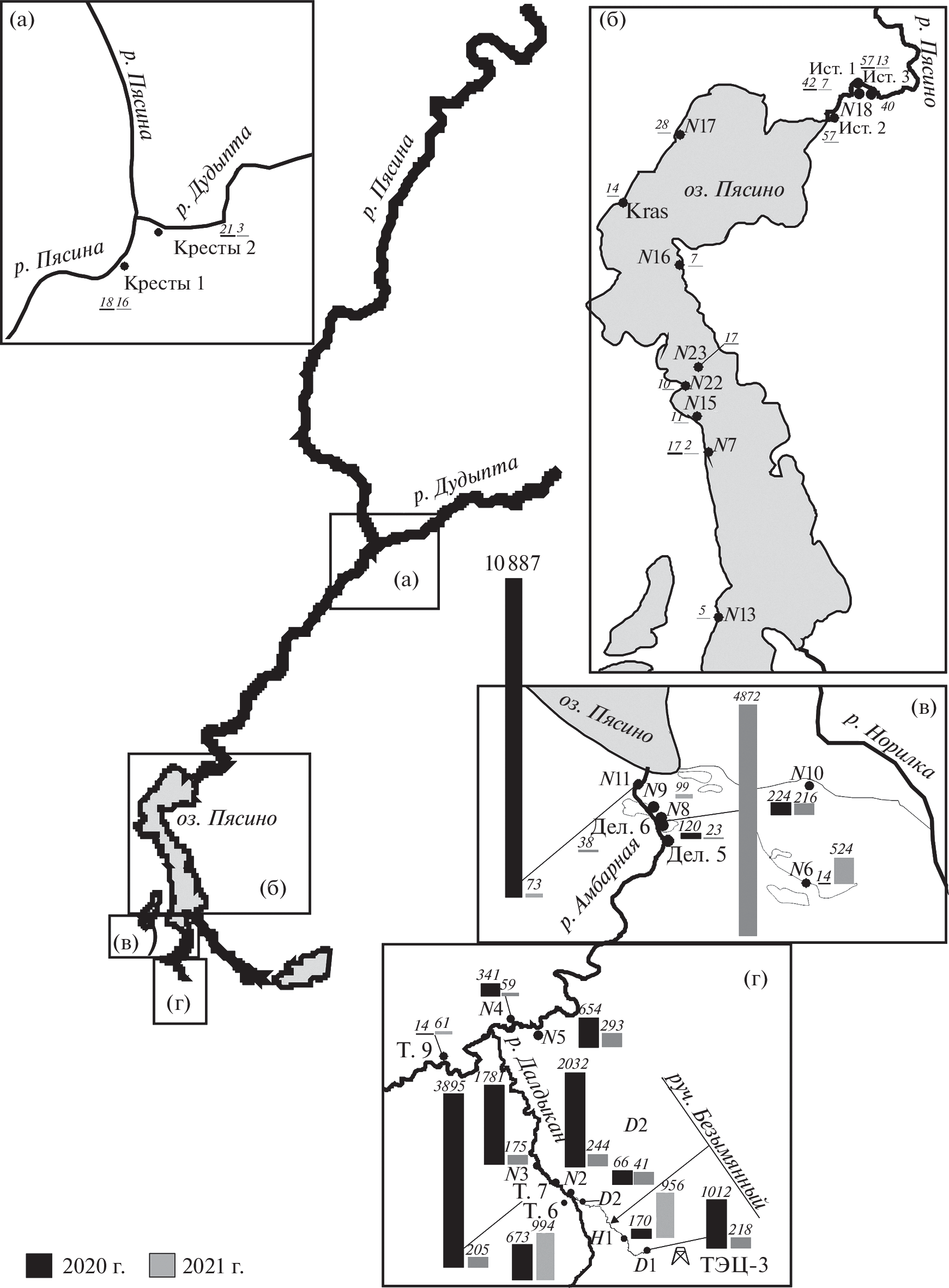 One year after the emergency diesel fuel spill in Norilsk, hydrocarbon concentrations in bottom sediments of the Norilo-Pyasinsky water system decreased. But on average in the areas they decreased in the same sequence (µg/g) as in 2020: the mouth of the Ambarnaya R. (835, σ = 1788) > Bezymyanny Cr. – the Daldykan R. – the Ambarnaya R. (306, σ = 273) > Pyasina R. (23, σ = 20) > Lake Pyasino (12, σ = 8). Concentrations decreased due to degradation of low molecular weight hydrocarbons. The content of polycyclic aromatic hydrocarbons in 2021 also changed in a smaller range (0–1027 ng/g) than in 2020 (0–3865 ng/g). Petroleum origin of hydrocarbons in the sediments of the Ambarnaya R. (including the mouth), Bezymyanny Cr. and Daldykan R. confirms the dominance of alkylated naphthalene homologues in their composition. Hydrocarbons accumulation in some horizons of the sedimentary strata is caused not only by seepage of diesel fuel, but also to the introduction of organic matter from the surrounding swamps from wetlands and floodplain lakes, as well as the burial of the surface layer by the 2021 flood.