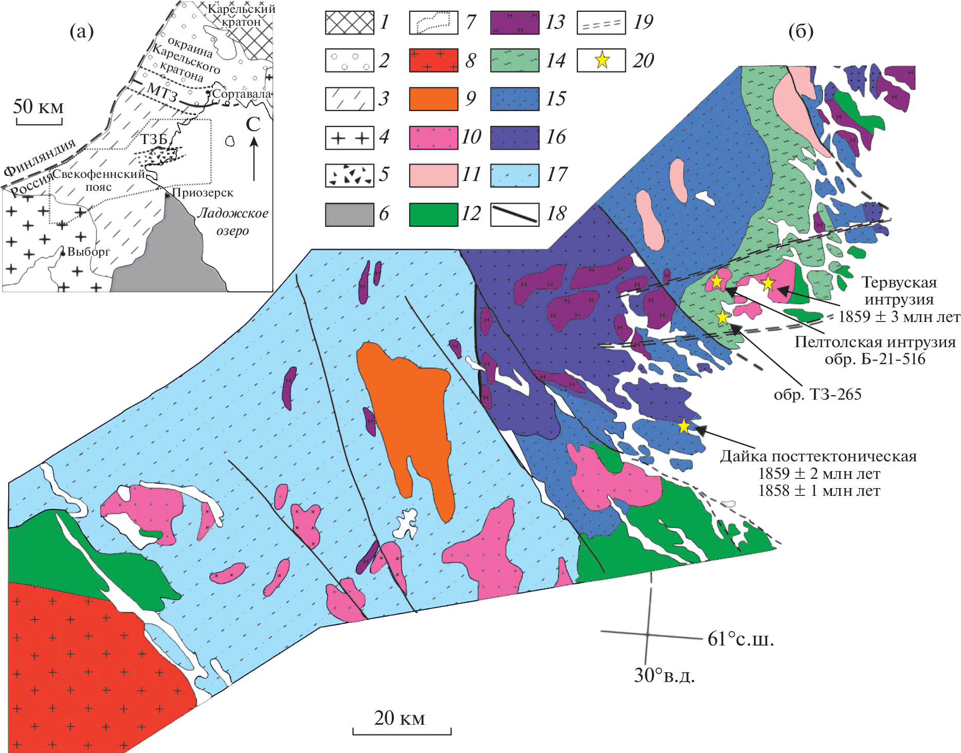The formation of breccia zones was taking place with the simultaneous healing of them by granitic materials at the final stages of the Late Proterozoic magmatic and metamorphic activity in the region 1.86 Ga ago. The Tervu breccia zone with granitic agmatites has a sublatitude orientation, which is discordant in relation to the early structures and Kurkieki enderbite and Lauvatsari-Impiniemi diorite-tonalite complexes in the Svecofennian rocks of the Ladoga region. There are the largest granitic bodies in this area – Tervu and Peltola intrusions located in the Tervu breccia zone. The U–Pb age of monazite from granites of the Peltola intrusion is determined as 1859 ± 4 Ma, and coincides with the age of the granites of the Tervu intrusion (1859 ± 3 Ma). This assumes that the granites of both intrusions and some surrounded smaller bodies were intruded simultaneously into the tectonically weakened space when plastic deformations turned to elastic-plasticity ones during at the late-orogenic stage. The results obtained reveal the features of the tectonic development of the joint zone of the two largest blocks of the Fennoscandinavian shield – the Karelian craton and the Svecofennian belt.