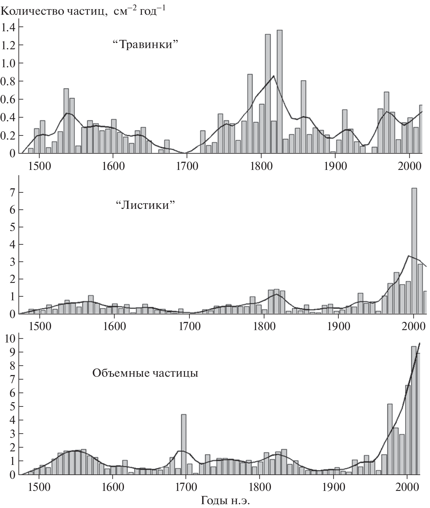 In the bottom sediments of lakes Shira and Uchum, located in the south of Siberia in the steppe zone of the North Minusinsk depression (Republic of Khakassia and Krasnoyarsk Territory), distributions of charcoal particles >100 µm. The age of the studied sediments of the two lakes was up to 1400 and 500 years ago, respectively. Charcoal particles of three types were found in the sediments of both lakes. The first group has an elongated shape and is interpreted as the remains of herbaceous plants and/or needles. The second group looks like thin flat blades and is interpreted as the remains of leaves. The third group consists of bulk particles of various irregular shapes, which are presumably the remains of the combustion of wood and coal. Particles of the first type are mainly indicators of natural fires, and their flux does not show a noticeable increase in the modern period. The flow of coal particles of the second and, to the greatest extent, the third groups has increased sharply in the last about a hundred years, which reflects an increase in the amount of wood and coal burned by people in the vicinity of the studied lakes in the modern industrial period. The data obtained reflect an increase in the amount of wood and coal burned by people in the modern industrial period, as well as a possible increase in the number of wildfires, which may also be due to human activities in the form of accidental or deliberate arson. Thus, for the first time for this region, an increase in the influx of charcoal particles into the bottom sediments of lakes over the past about a hundred years has been revealed, which is unprecedented over the period covered by our study. Thus, evidence of the anthropogenic impact on the dynamics of charcoal particles in bottom sediments has been obtained. The information obtained can be useful for reconstructing the dynamics of natural fires and paleo-climate in this region of southern Siberia in the Late Holocene.