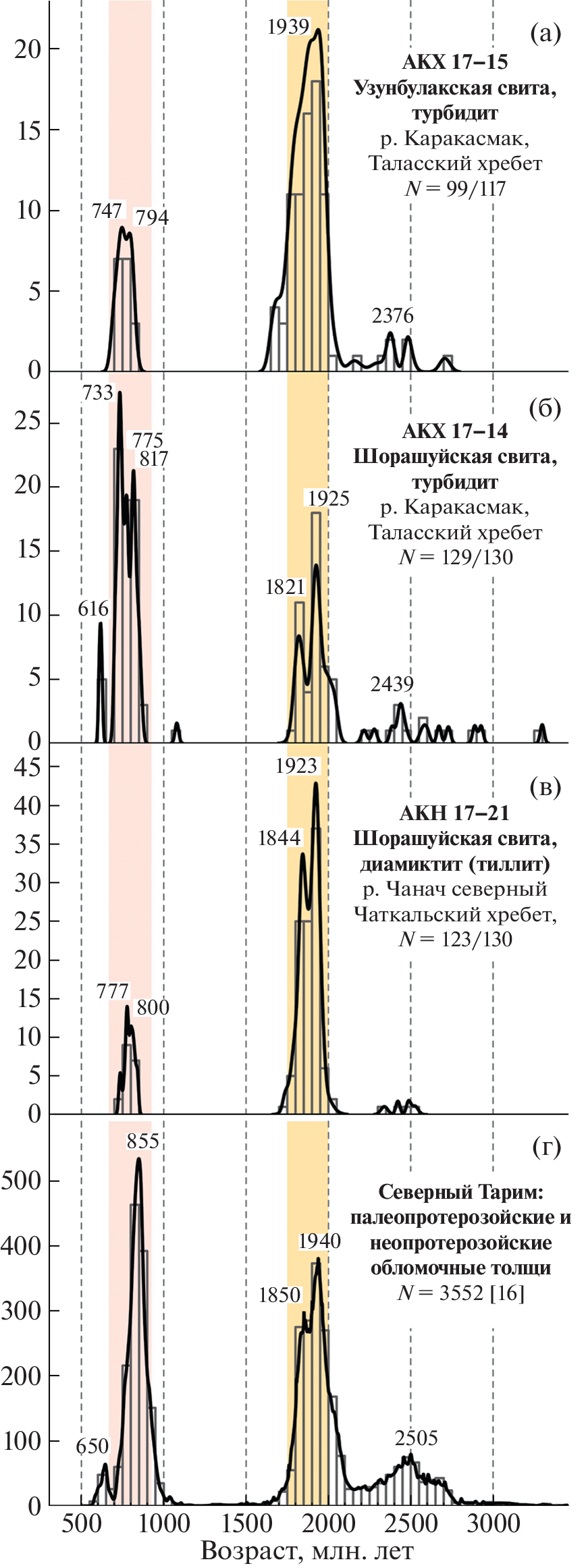 With the aim to improve our understanding of the age and genesis of the Neoproterozoic diamictites of the Middle Tianshan of Kyrgyzstan, we studied the late Precambrian strata of the Sandalash, Talas and Chatkal Ranges. The results of detrital zircon dating indicate that diamictites were deposited in the Cryogenian and Ediacaran. Diamictites in the lower part of the Shorashu Formation comprise tillites and were likely deposited during the Marino glaciation ca 640–635 Ma. Diamictites in the upper part of the Shorashu Formation represent debris flows and grain flows associated with turbidites and, apparently, have non-glacial origin; their age is not older than the early Ediacaran 616 ± 7 Ma. The pinching out of the Shorashu Formation to the north and the predominantly southerly directions of sediment transport in turbidites indicate that a non-depositional uplift located north of the basin. The distributions of detrital zircon ages in the studied samples are characterized by large peaks at 0.7–0.8 and 1.8–1.9 Ga and small peaks at ca 2.4–2.5 Ga and are almost identical to the age distributions in the Proterozoic sediments of the Tarim Craton. Comparison of the studied strata with key sections of the Kuruktag Range in the NE Tarim suggests that the diamictites of the lower part of the Shorashu Formation are analogues of late Cryogenian Tereeken tillites, and the slope facies of the upper part of the section are analogues of the early Ediacaran turbidites of the Zhamokti and Yukkengol Formations.