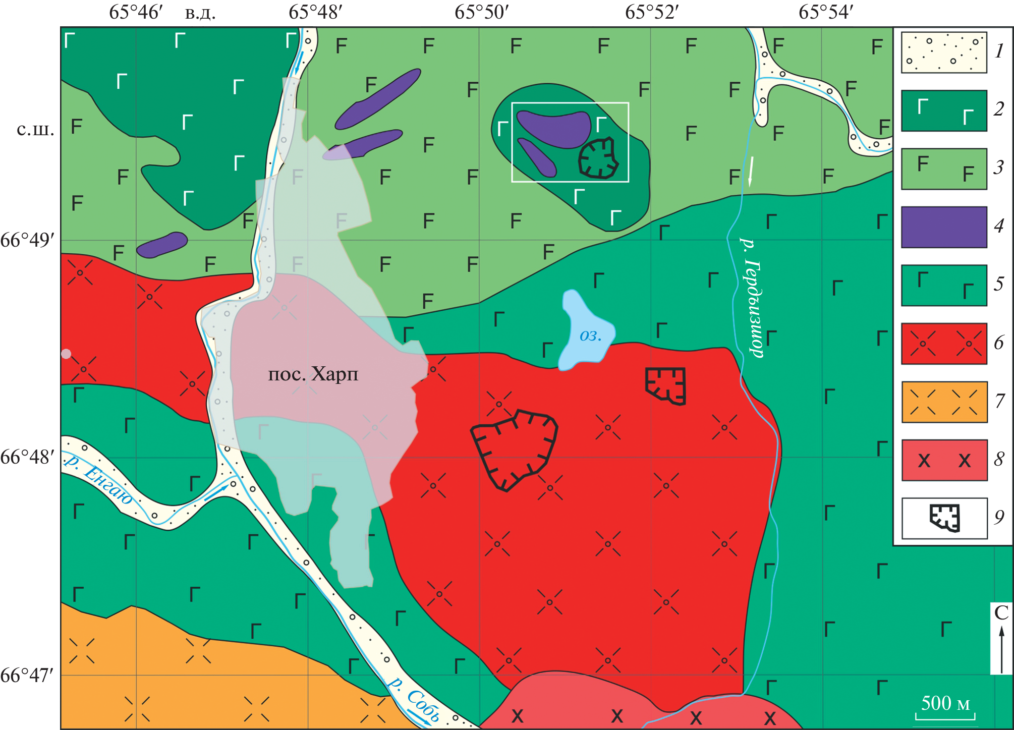 For the first time, a new noble-metal (Pt–Au–Pd) Vasilinovskoe ore occurrence discovered near the village of Kharp in the Yamalo-Nenets Autonomous Okrug is described. It is associated with amphibolized gabbroids and subordinate pyroxenites of the Kershor complex, dated mainly to the Late Ordovician. In these rocks, mineralization zones with an apparent thickness from 0.5 to 50 m (sulfides 3–5 vol.%, occasionally more) are developed. In areas with scattered or finely nested sulfide inclusions, feldspar-quartz, epidote and other veins are often present. According to assay data, in substantially sulfide 0.5–1 kg samples of these, in general, low–sulfide zones, the Pd content reaches 1.4 g/t, Au – 0.8 g/t, and Pt – 0.2 g/t. PGE minerals are represented by abundant secretions of micron–sized palladium tellurides – merenskite PdTe2, temagamite Pd3HgTe3, kotulskite PdTe, as well as other noble metal compounds – sadberite PdSb, arsenopalladinite Pd8(As,Sb)3 and others. In addition to these palladium minerals, the magnetite–chalcopyrite–pyrite association contains microinclusions of native silver, native bismuth and native tin. In the later polysulfide–feldspar–carbonate–quartz association, Au and Ag tellurides, native gold (including Hg-bearing), Se-containing argentite, greenockite are found. The formation of parageneses of precious metals is associated with late magmatic processes, as well as with redistribution by subsequent magmatogenic hydrothermal fluids, up to a temperature of ~250°C; pressure decreased from ~0.9–1.3 to ~0.4–0.5 kbar.