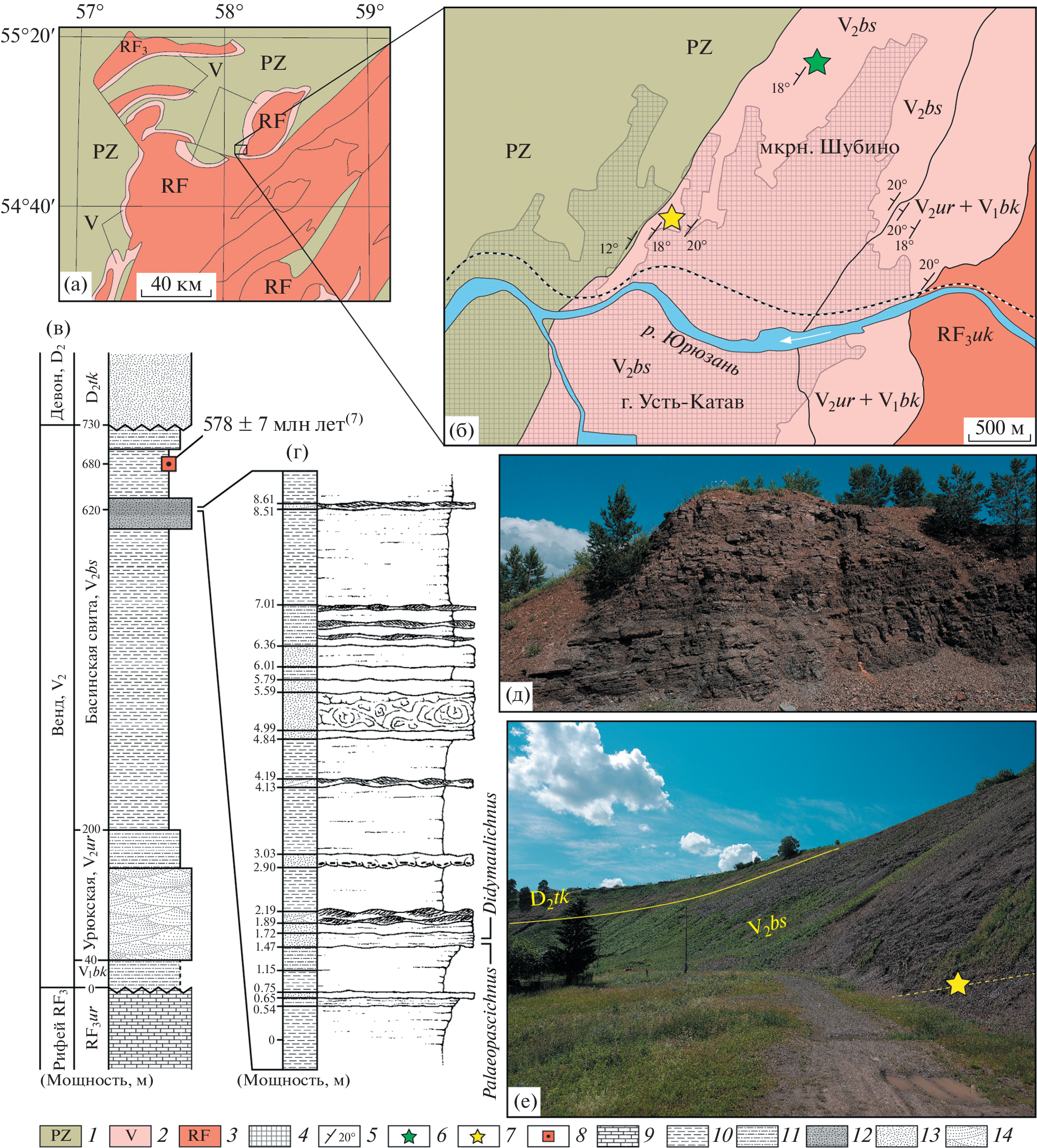 Изучены ихнофоссилии и остатки палеопасцихнид из басинской свиты ашинской серии венда Южного Урала (юго-западная периферия Сулеймановской антиклинали, Челябинская обл., г. Усть-Катав, Шубинский карьер). Показано, что общая морфология и сохранность ихнофоссилий схожи с поздневендскими–раннекембрийскими субгоризонтальными двулопастными норами Didymaulichnus. Установлено, что палеонтологические остатки приурочены к крайне мелководным обстановкам осадконакопления и расположены стратиграфически ниже пласта вулканических туфов, циркон из которых имеет U–Pb-изотопный возраст 578 ± 7 млн лет. До настоящего момента считалось, что первое появление роющих организмов и связанная с ними “агрономическая революция” приурочены к временному интервалу ~560–550 млн лет. Результаты нашего исследования показывают, что подвижный бентос и биологическое перемешивание осадка могли появиться на 20–30 млн лет раньше, а также подтверждают гипотезу о том, что начало первой “агрономической революции” и “кембрийского взрыва” биоразнообразия значительно не совпадали по времени.
