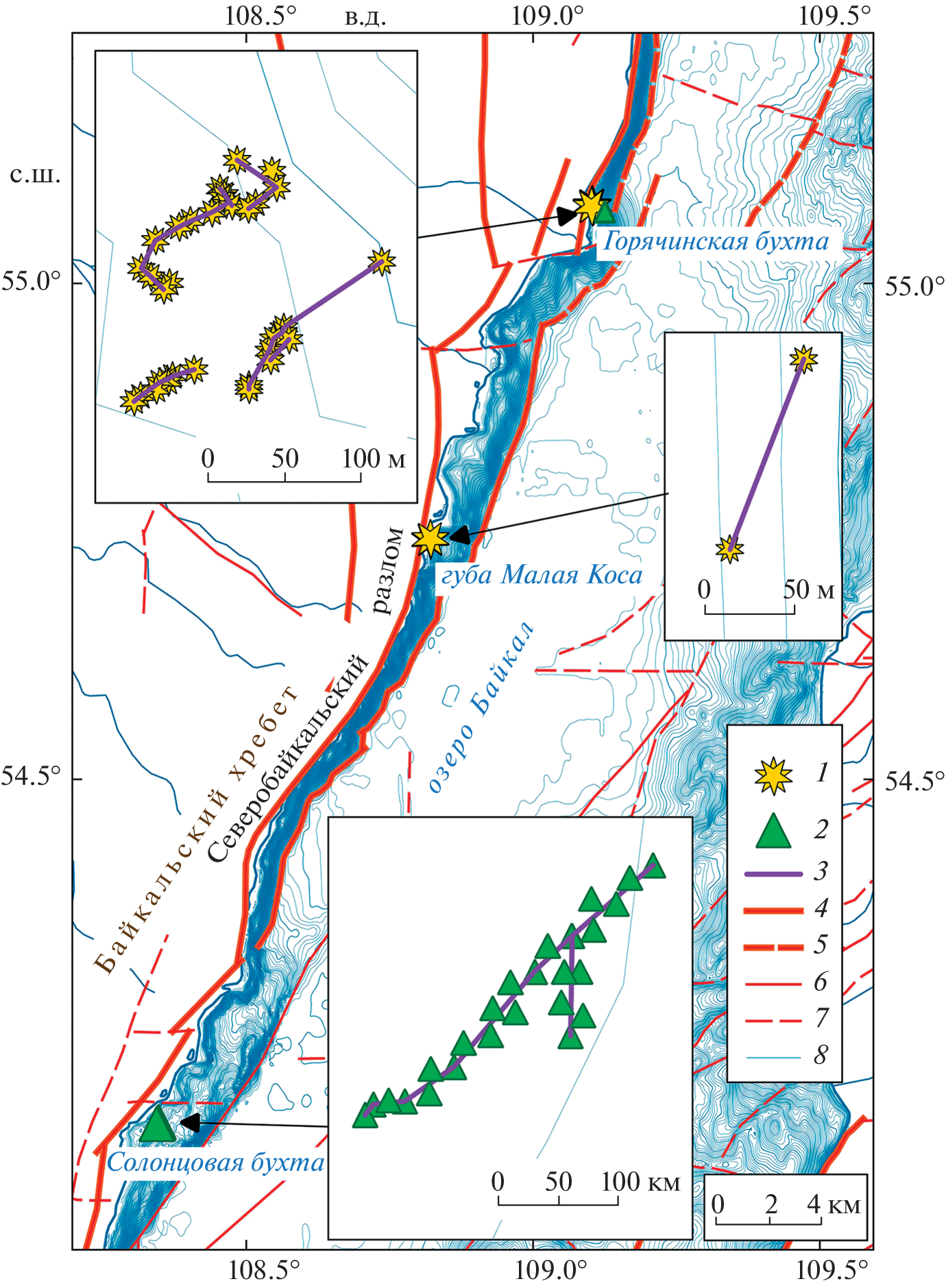 We present new data on manifestations of mud volcanism accompanied by gas emissions in Lake Baikal. Brittle deformations of the bottom with traces of erupted liquefied sediments were found in the Malaya Kosa Bay and the Goryachinskaya Bay in the North Baikal depression at depths of 105–163.6 m. The deposits outcropping in the extended scarps and mud craters are mainly represented by highly-porous clays. In places there are ledges of boulder-pebble sediments. The areas of the mud volcanism distribution are confined to the damage North Baikal fault zone, indicating its current activity. Disturbance of the clays and soft sediments covering them indicates the recent eruption of gas-saturated fluid and mud. At depths of 157–162 m in the Goryachinskaya Bay, cone-shaped structures ∼5 × 5 cm in size with a crater in the top part were found in them. Similar griffons were revealed in the Solontsovaya Bay along rectilinear faults opposite the paleoseismic rupture of the same name. It is necessary to continue studying the revealed shallow-water manifestations of mud volcanism and rupture deformations of the bottom by staging complex geological and geophysical studies.