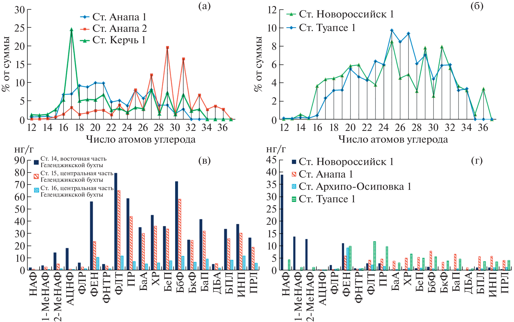 The current level and origin of hydrocarbons (HCs) was determined: aliphatic – AHCs and polycyclic aromatic – PAHs (September 2021, May and September 2022) in suspended particulate of surface waters (for AHCs – 20 µg/l; PAHs – 130 ng/l, fluorescent method) and in the bottom sediments of the coastal areas of the Caucasian sector of the Black Sea of the Russian Federation. Despite the decrease in HC concentrations in surface waters in recent years, the most polluted areas include, as before, the Kerch Strait. HC accumulate in bottom sediments, which leads to an increase in their content in the composition of Corg (up to 14.2% in the Tuapse region and 13.1% in the Novorossiysk region). It has been established that, along with pollution, HC levels are greatly influenced by natural processes (the productivity of the area, fluid flows from the sedimentary mass).