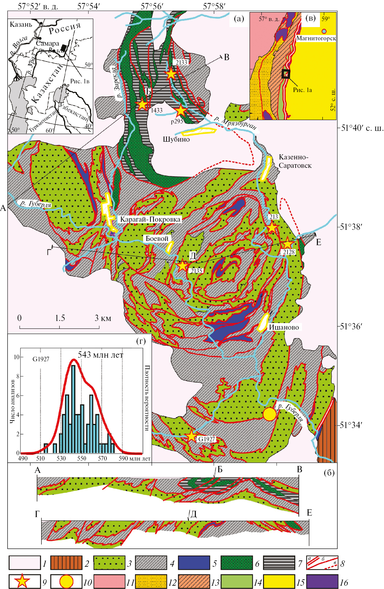 Рис. 1. Максютовский комплекс в районе Шубинского титанового месторождения (а), составлено с использованием [13], геологические разрезы по линиям А‒Б‒В и Г‒Д‒Е (б), схема структур Южного Урала (в), гистограмма и график плотности вероятности распределения возрастов зерен обломочного циркона из метагравелитов карамалинской серии (г) из [9]. 1 – рыхлые кайнозойские отложения; 2 – палеозойские отложения нерасчлененные; 3 – юмагузинская “серия”, метааркозы, фенгитовые кварциты с глаукофаном, метаграувакки, метавулканиты среднего состава; 4 – карамалинская “серия”, графитистые кварциты и кварцито-сланцы, метаграувакки, метавулканиты основного и среднего состава; 5 – серпентинитовый меланж с блоками метагабброидов; 6–7 – тектонический микстит: 6 – зоны сближенных тел эклогитов, 7 – фенгитовые и глаукофан-фенгитовые сланцы, графитистые сланцы; 8 – тектонические контакты: Главный Уральский разлом (а), прочие разломы – картируемые (б), предполагаемые (в); 9 – точки отбора проб на U‒Pb-исследования и их номера; 10 – местонахождение известняков с археоциатами; на схеме (в): 11 – Башкирский мегантиклинорий, рифейские и вендские терригенные, карбонатные и вулканогенные толщи, 12 – Зилаирский синклинорий, терригенные толщи верхнего девона-карбона, 13–14 – зона Уралтау, кварциты и сланцы докембрия и палеозоя (13), эклогит-глаукофансланцевый максютовский комплекс (14), 15 – Магнитогорская мегазона, ранне-среднепалеозойские вулканогенные и вулканогенно-осадочные надсубдукционные и рифтогенные комплексы, 16 – аллохтоны с офиолитами. Черным прямоугольником обозначено положение рис. 1 а. На обзорной географической схеме показано положение района рис. 1 в.
